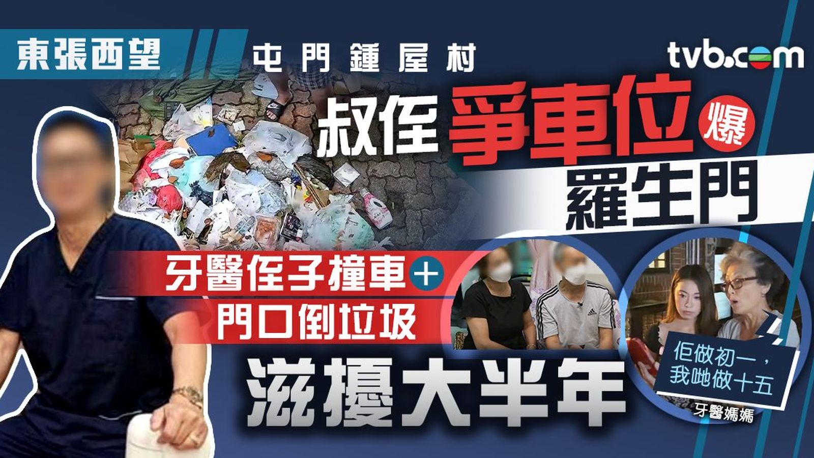 一世人兩叔姪,竟然搞到反目成仇?今集《東張西望》收到居於屯門鍾屋村的鍾先生報料,他投訴同樣居住於鍾屋村的牙醫侄子近年不斷滋擾他們,包括不斷報警、口半夜洗車、高空淋水、家門前倒垃圾等滋擾行為。