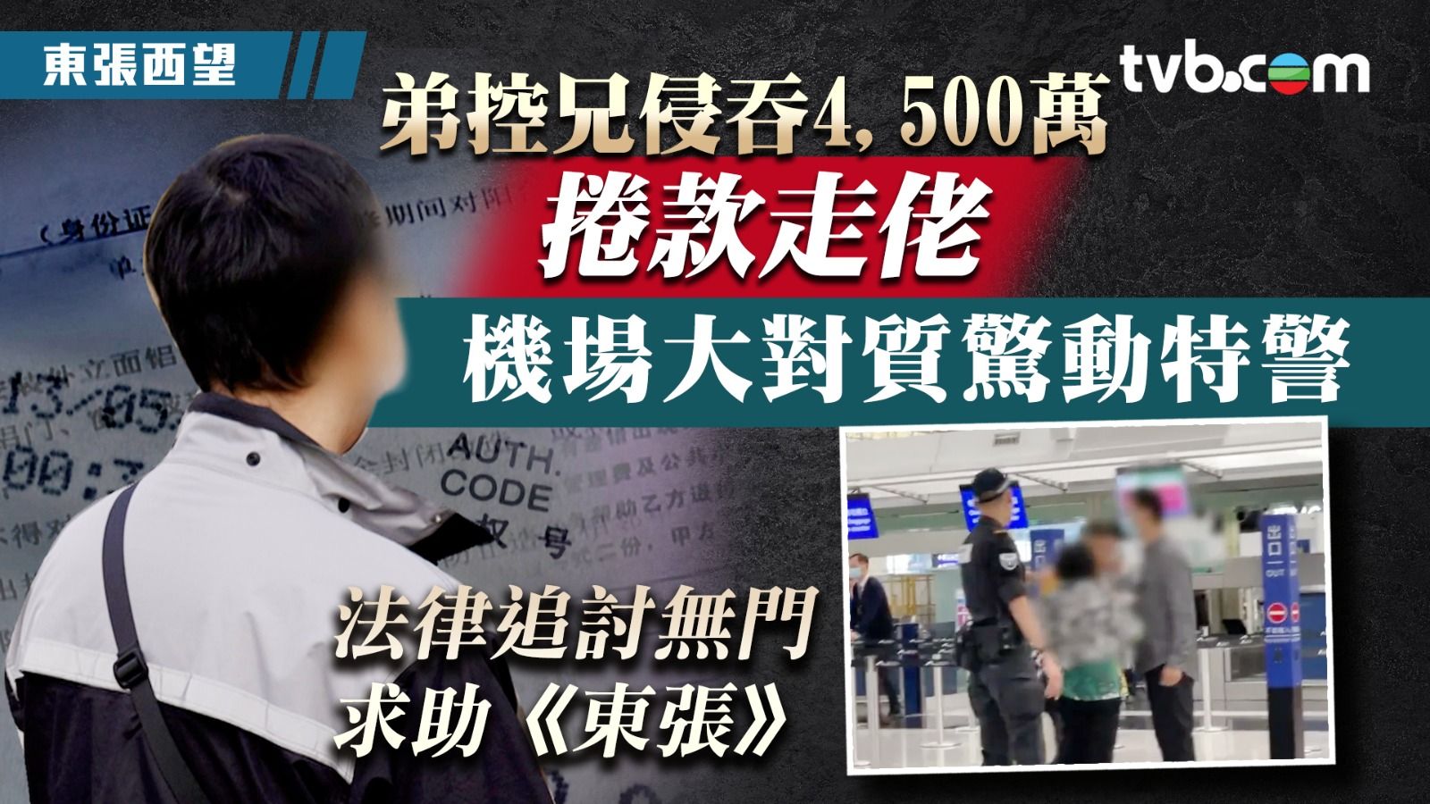 《東張西望》早前收到事主林先生報料,控訴哥哥侵吞財產4,500萬,十幾年來未能討回。林生更發現哥哥搬走家中保險箱,又與媽媽買定機票離港。林生趕往機場阻止,兩兄弟當面對質,愈嘈愈激烈,更驚動機場特警到場戒備。