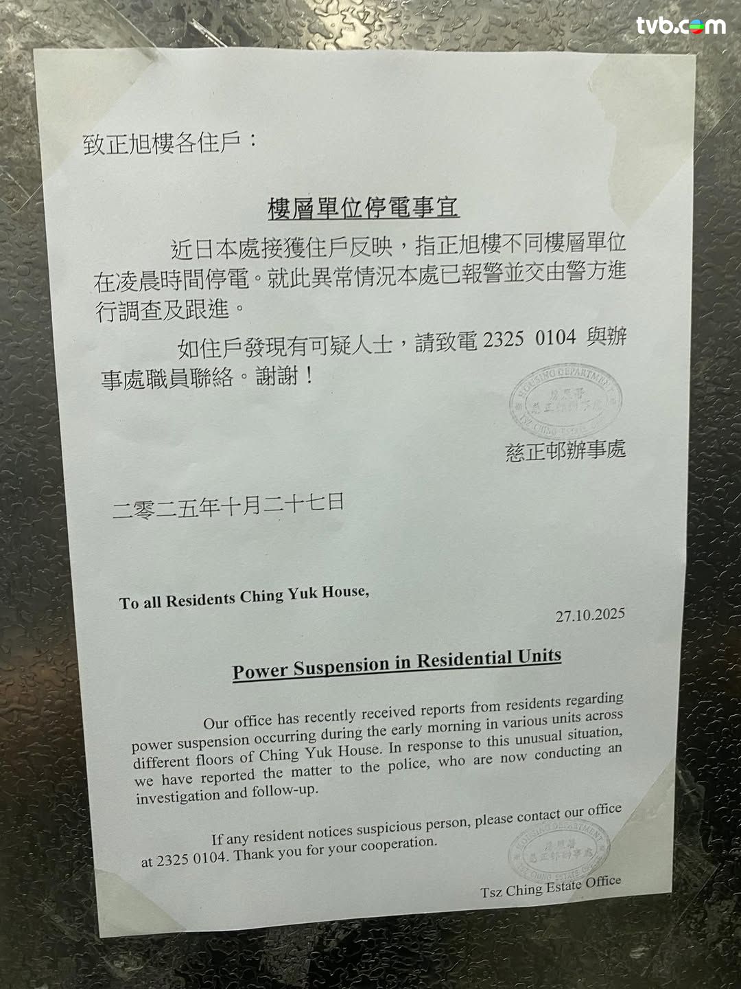 有網民發帖指慈正邨正旭樓於上周一(27日)凌晨發生停電,展示出房署辦事處發的通告,稱接獲住戶反映不同樓層單位停電後,辦事處已因「異常情況」報警,由警方調查及跟進,並呼籲住戶如發現可疑人士即時通知職員。樓主在帖交稱「停電應該搵工程佬睇!點解要報警?」