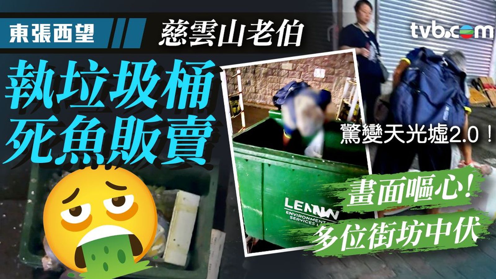 慈雲山驚變天光墟2.0!《東張西望》去年報道過葵涌天光墟,有無牌的黑心攤販「刺身姐」、「填鴨姐」等撿「加料」垃圾重組售賣。《東張西望》收到觀眾爆料,發現慈雲山一名陳姓伯伯與二人手法如出一轍,撿垃圾桶死魚、廚餘擺攤販賣。