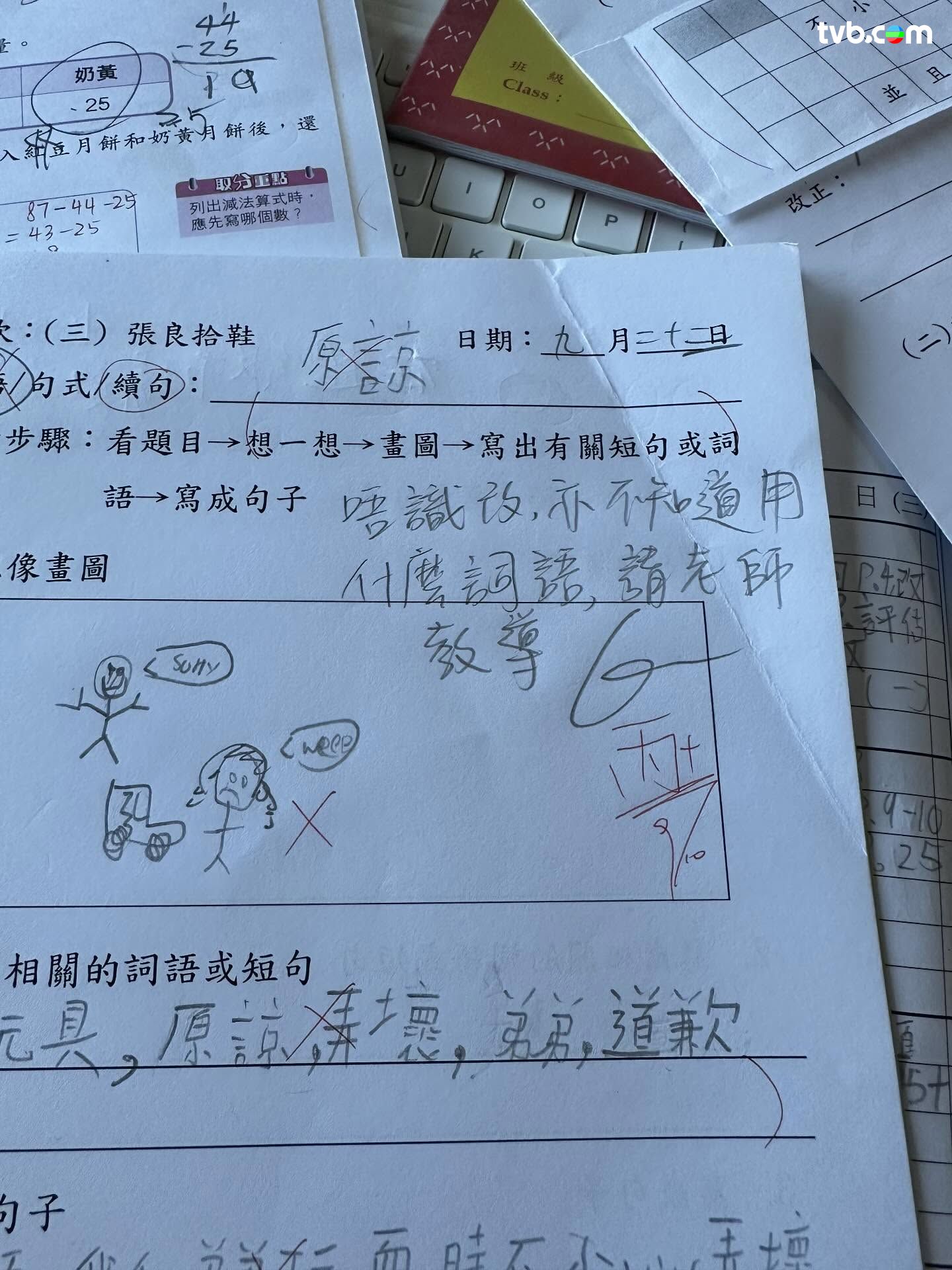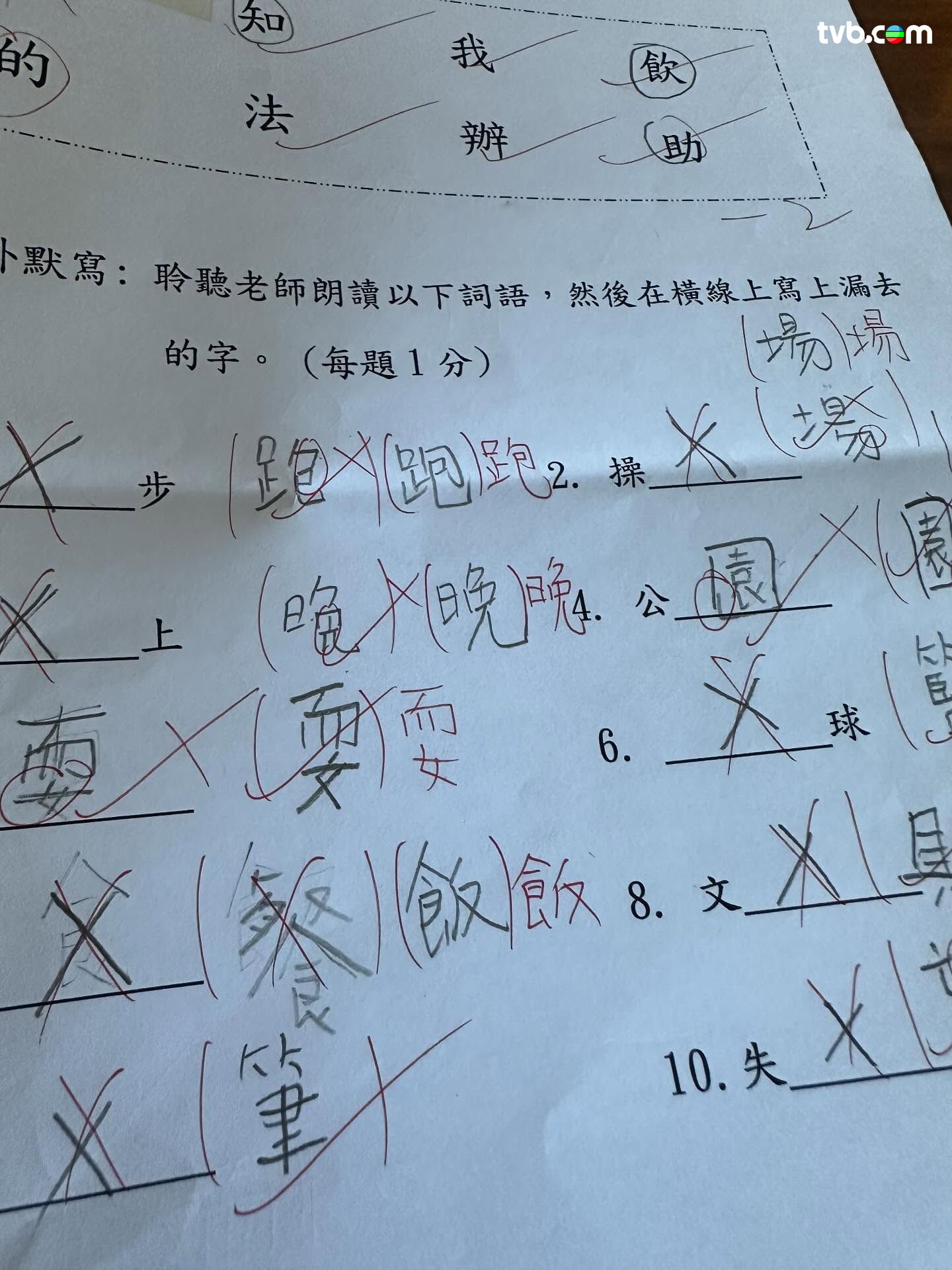 照片可見,港媽兒子一張默寫練習顯示,孩子面對「文具」、「跑步」等詞語時未能作答,僅以交叉符號代替;至於「晚」、「園」等字雖然寫出,但因筆畫或結構錯誤被老師圈出要求修改,部分錯字更在更正後仍被要求再改;港媽甚至在工作紙上寫「唔識改,亦不知道用什麼詞語,請老師教導!」