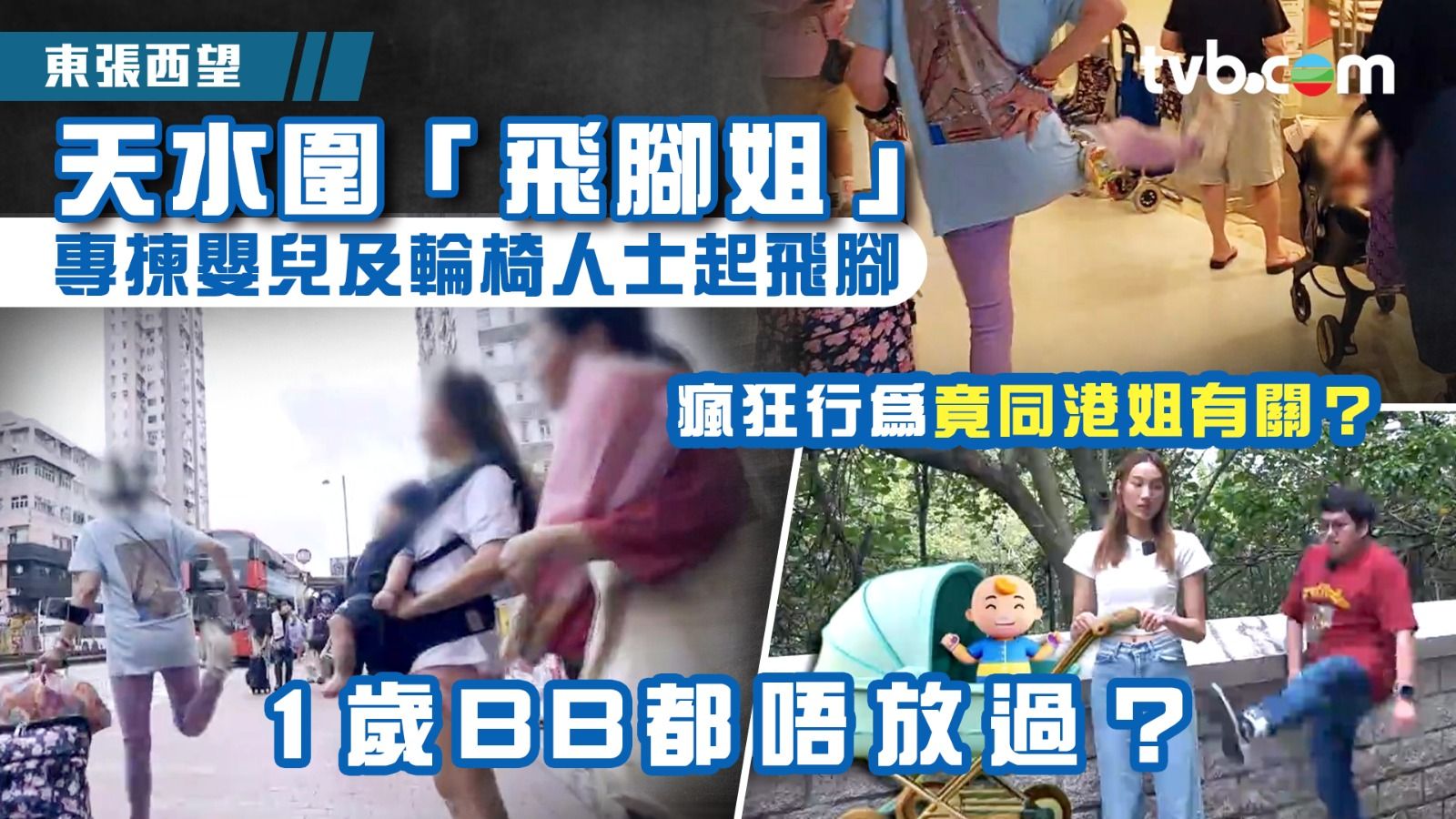 《東張西望》收到多位天水圍街坊報料,投訴區內一名踩幾吋高厚底鞋的女士每當見到BB車,或輪椅經過就做出踢腿動作,也會踢跌「小心地滑」告示牌,行為怪異!與「飛腳姐」同住一棟大廈的曾先生亦曾中招,他表示非常擔心她會傷害到弱小的嬰兒。