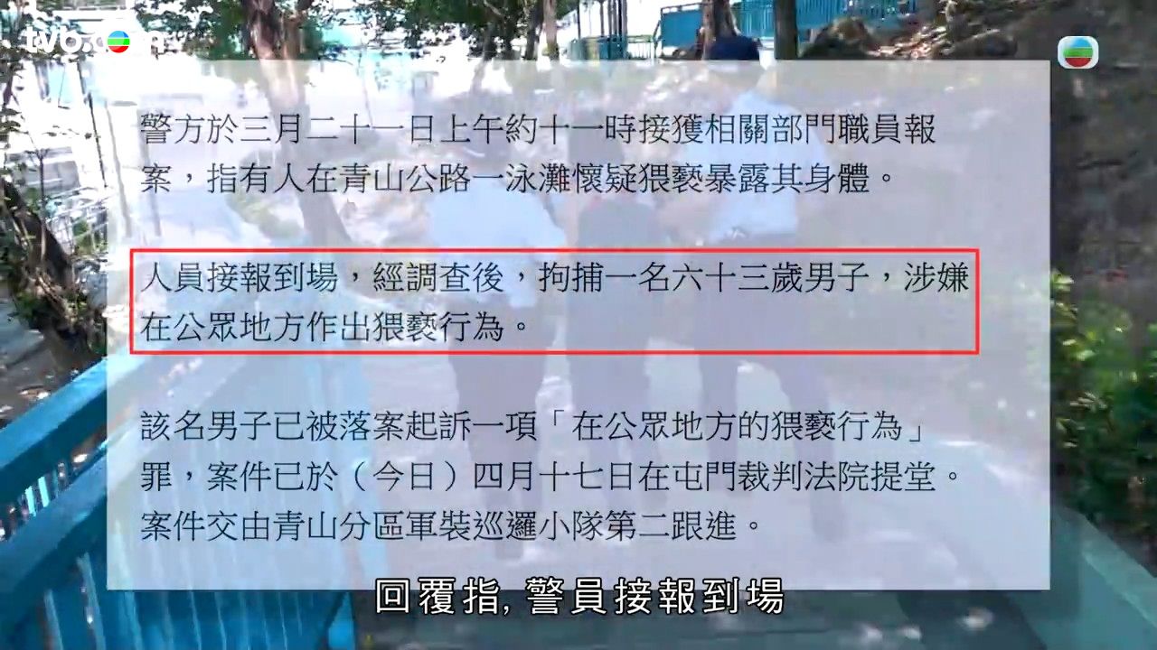 而康文署職員得悉情況後亦報警處理,其後警員帶走涉事男子回警署作進一步調查。事後警方回覆,警員接報到場經調查後拘捕一名63歲男子,涉嫌在公眾地方作出猥褻行為,已被落案起訴,被判守行為12個月。![]()