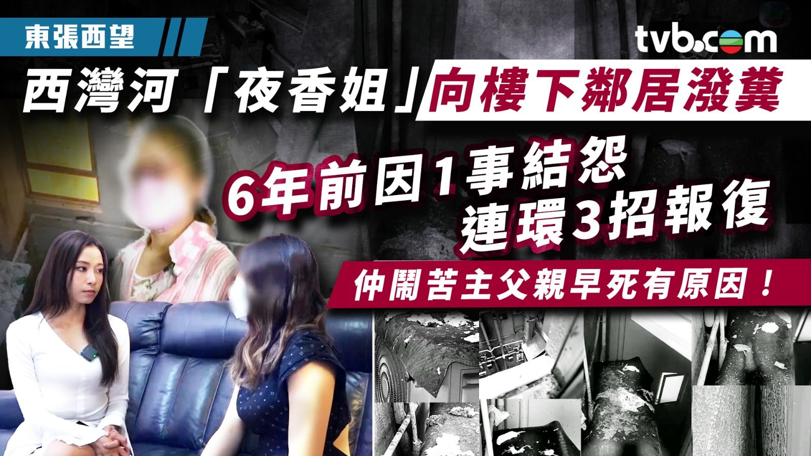 《東張西望》今集事主葉小姐與哥哥、母親一家三口住在西灣河一座接近50年樓齡的私人大廈,她指遭樓上怪鄰長年瘋狂滋擾,由最初的製造噪音、造謠升級到每日潑糞到其單位的冷氣槽上,畫面極度嘔心,苦主求助無門遂報《東張西望》幫手。