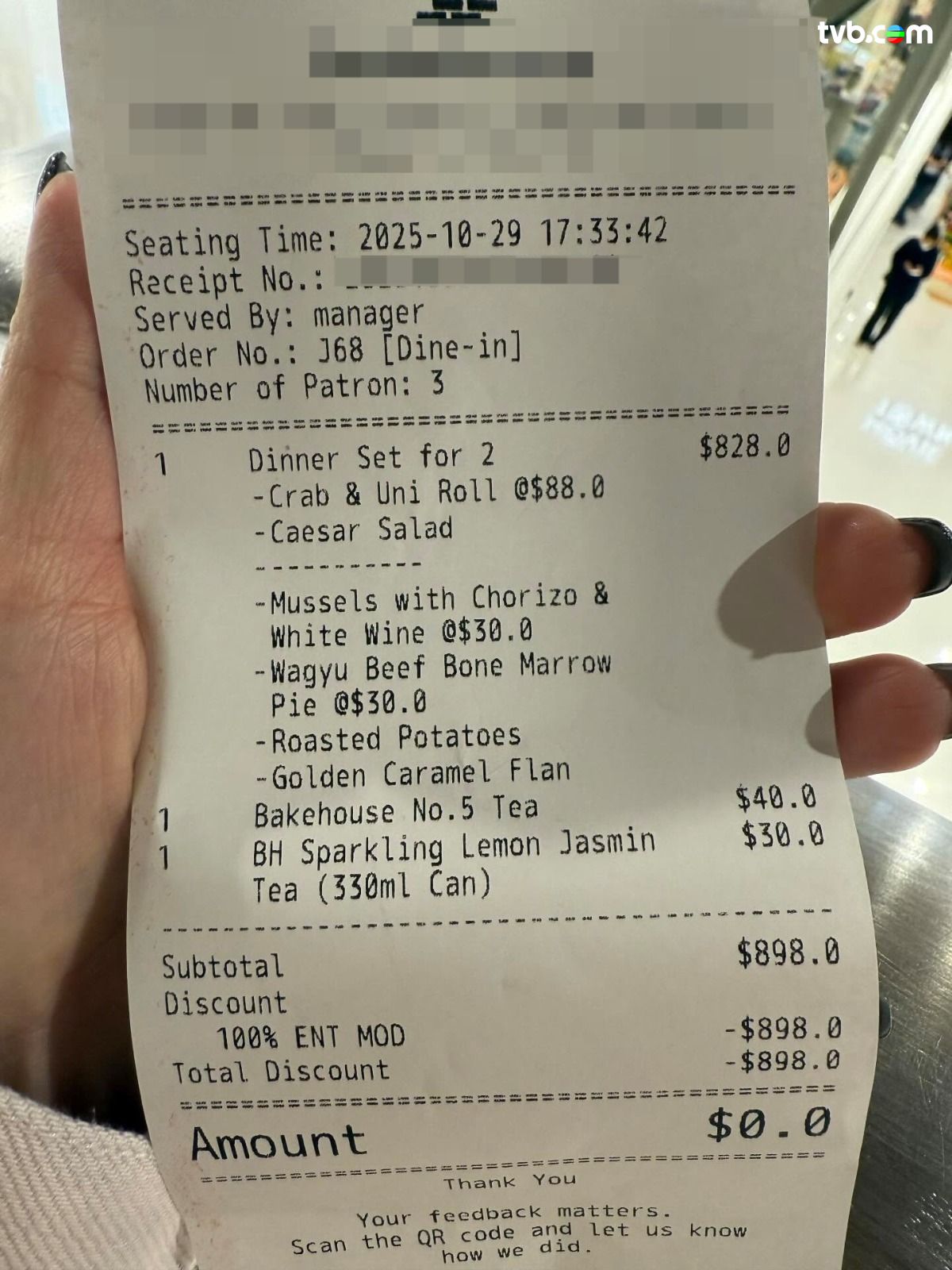 原文:「今晚同奶奶去食飯時,餐廳同事打瀉飲品彈到奶奶條白色褲小小,餐廳有即刻道歉同奉上大量濕紙巾。之後應該係餐廳manager過黎叫我地拎條褲去乾洗,餐廳會出返錢,但我奶奶覺得好小事就婉拒左。點知食曬成餐飯到俾錢時,經理話因為整污糟我地衣物,所以free左我地成張單!成件事太意想不到行出餐廳後重震驚緊!」