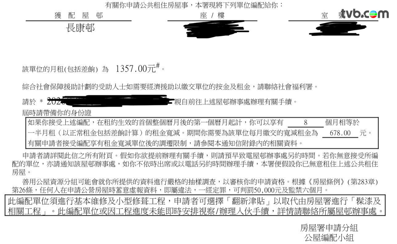 早前有網民發文大呻,指自己最初因嫌棄東涌公屋地點偏遠,選擇了拒絕首派,最終第二次幸運獲派至青衣長康邨;惟今次房署「配房通知信」竟特別註明,單位可享有長達八個月的「半額租金寬減」,每月租金由原本約1,357元,大幅劈至僅需繳付678元!樓主即擔憂「姐係間屋空置左一段長時間,會唔會係凶宅?」、「如果係凶宅佢會唔會寫明?」