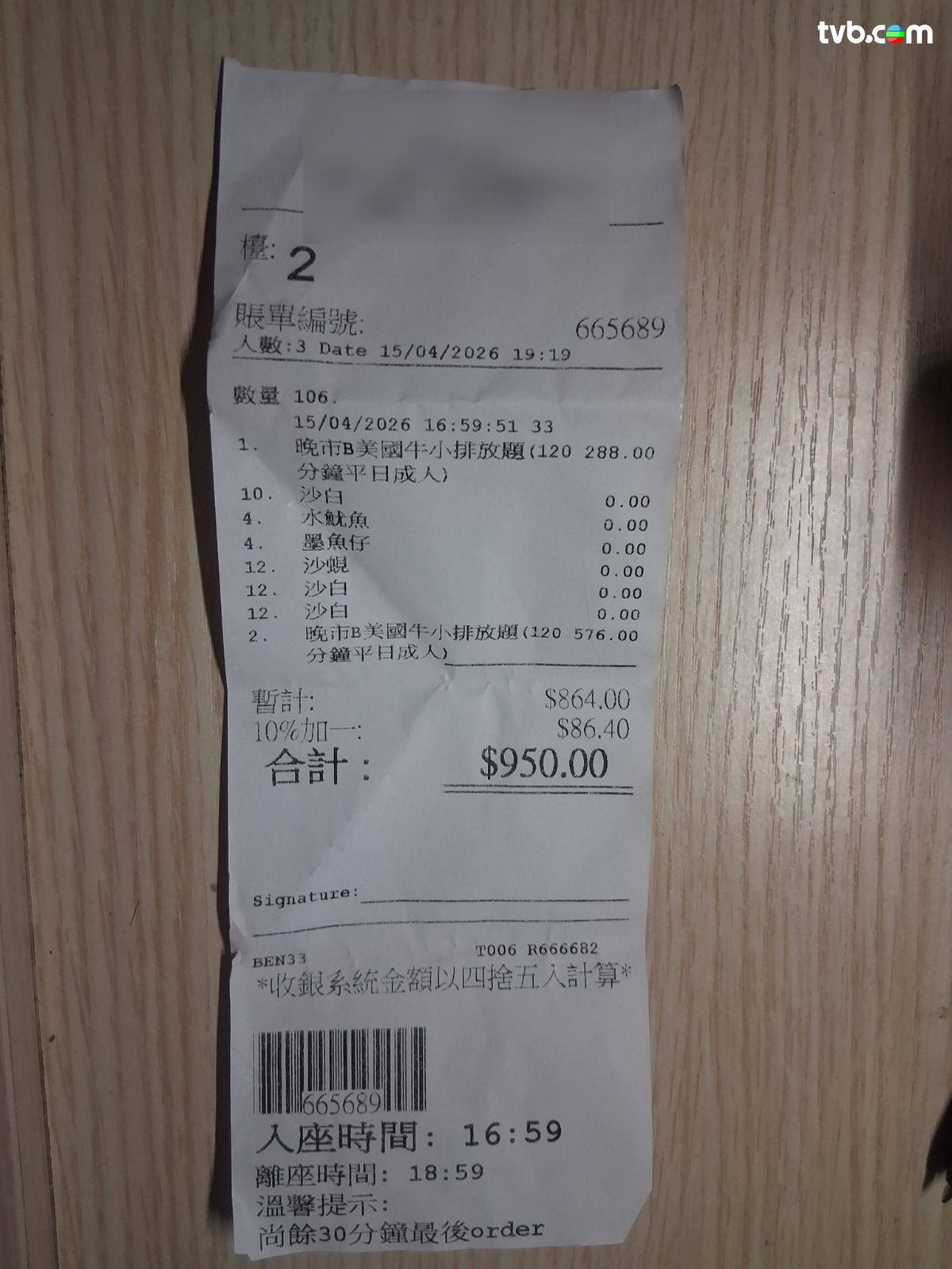 事主指出,餐廳在整個用餐過程中,從未主動說明所謂「無限時」實際設有點餐限制,包括僅提供90分鐘QR code點餐時間及最後30分鐘為截單安排,相關資訊直至結帳後才於收據上的「溫馨提示」中列明:「到我畀完錢你先至畀張單我,溫馨提示上寫住30分鐘係最後last order,咁你又唔好同阿你講無限時啦」、「 無限坐唔係無限時放題任食」。
