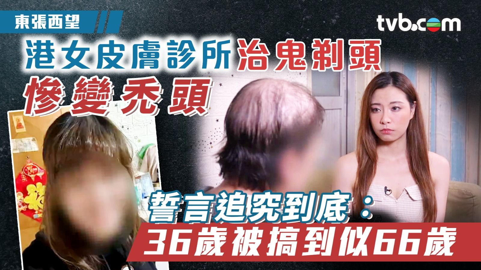 《東張西望》今集收到事主阿May的報料,指控一間皮膚科診所醫生將她醫到變禿頭,誓言要追究到底。