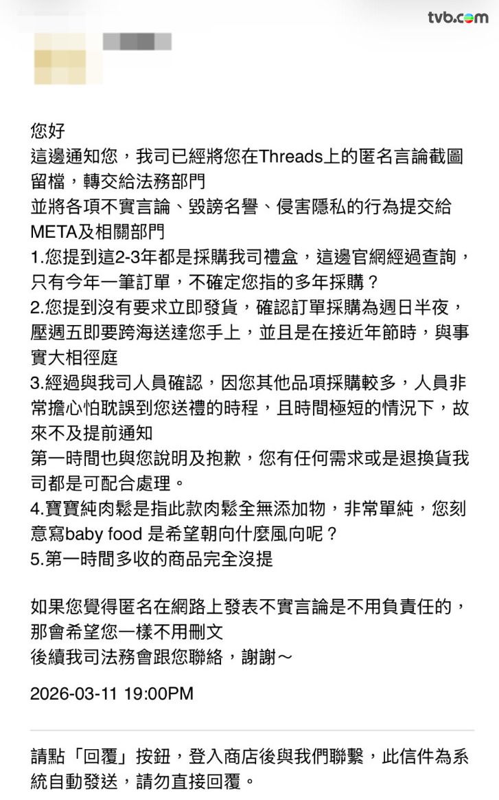 過一個月多,店方再發出電郵,表示已將樓主發表的相關貼文及截圖,轉交公司法務部門及 META 相關單位存檔跟進,並列出五點澄清:其一是指經官網查核,事主過去兩、三年並無長期訂購紀錄,今年只得一筆禮盒訂單;其二重申事主並無要求即日出貨,而訂單確認為周日半夜下單、需時五日海運寄送香港,出貨時間與實際送達節奏相符。