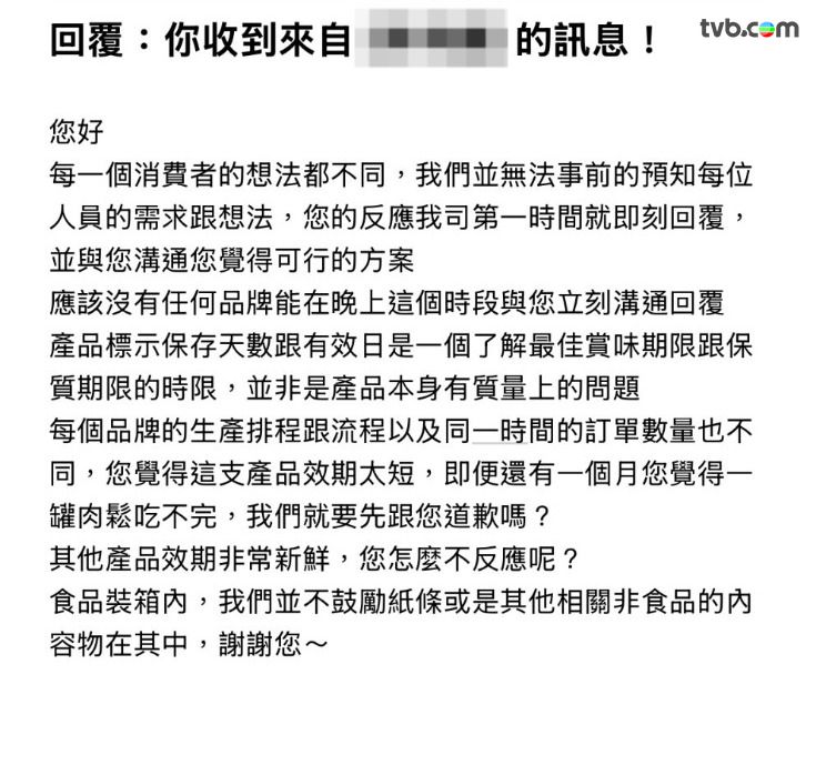 樓主再收悉另一封電郵,店方稱「每個消費者的想法都不同」,強調難以事前預知每位客人的需求和期望,並指已在第一時間提可行的方案。店方解釋,產品標示的保存天數與有效日期,主要是讓消費者理解最佳賞味期與保質期限的分別,並非反映產品本身出現品質問題,又指受生產排程、物流及個別訂單數量影響,難以保證每一罐商品都擁有「覺得合理」的效期長度。店方更反問「那其他效期非常新鮮的商品,您怎麼不反應呢?」電郵亦提到,店方不鼓勵顧客在食品紙盒內,放置任何與食品無關的物品。