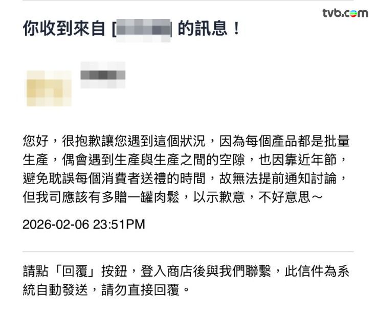 有港人分享經歷,樓主指已連續二至三年都購買台灣某品牌的禮盒,惟見店方今年推出標榜保質期有6個月的「寶寶肉鬆」,特意加購兩罐寄回香港,怎料收貨後檢查才發現有效期只剩約3星期(21天)。事主隨即電郵查詢,本以為是出貨疏忽,卻驚覺店方早已知道產品臨近到期,只以「多送一罐」作補償,樓主炮轟「問題不是你送多送少,問題是寶寶根本吃不完,是要當飯吃嗎?」