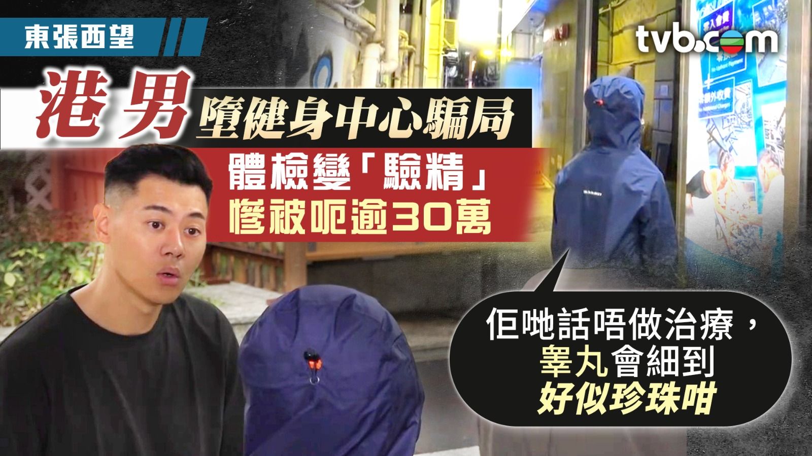 《東張西望》收到一名智力有限的男子文仔報料,稱外出遇人搭訕並誘導至健身中心,更被安排驗精,中心職員聲稱事主的精子含量低,遊說事主購買逾30萬元的療程。
