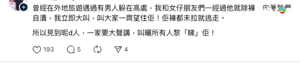 另外,網友分享遇到露體狂的經驗,並公開應對方法,留言:「曾經在外地旅遊遇過有男人躲在高處,我和女仔朋友們一經過他就除褲,向著我們自瀆,我立即大叫,叫大家一齊望住佢!佢褲都未拉就逃走。所以見到呢d人,一家要大聲講,叫曬所有人黎「睇」佢!」