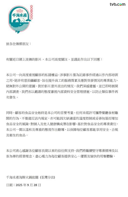 食店事後發出聲明,指涉事影片原本僅供內部培訓及應變記錄之用,對於片段意外流出及令食客樣貌曝光感到非常遺憾。餐廳已即時展開內部調查,加強資訊保安及員工守則,防止同類情況重演。店方重申,保障客人食品安全是首要責任,呼籲勿未經許可攜離食材,因食物若缺乏適當包裝或冷藏可能增加變壞風險,威脅健康。餐廳一向以禮貌和溫和方式規勸顧客,期望大家安心享用安全合規美食。