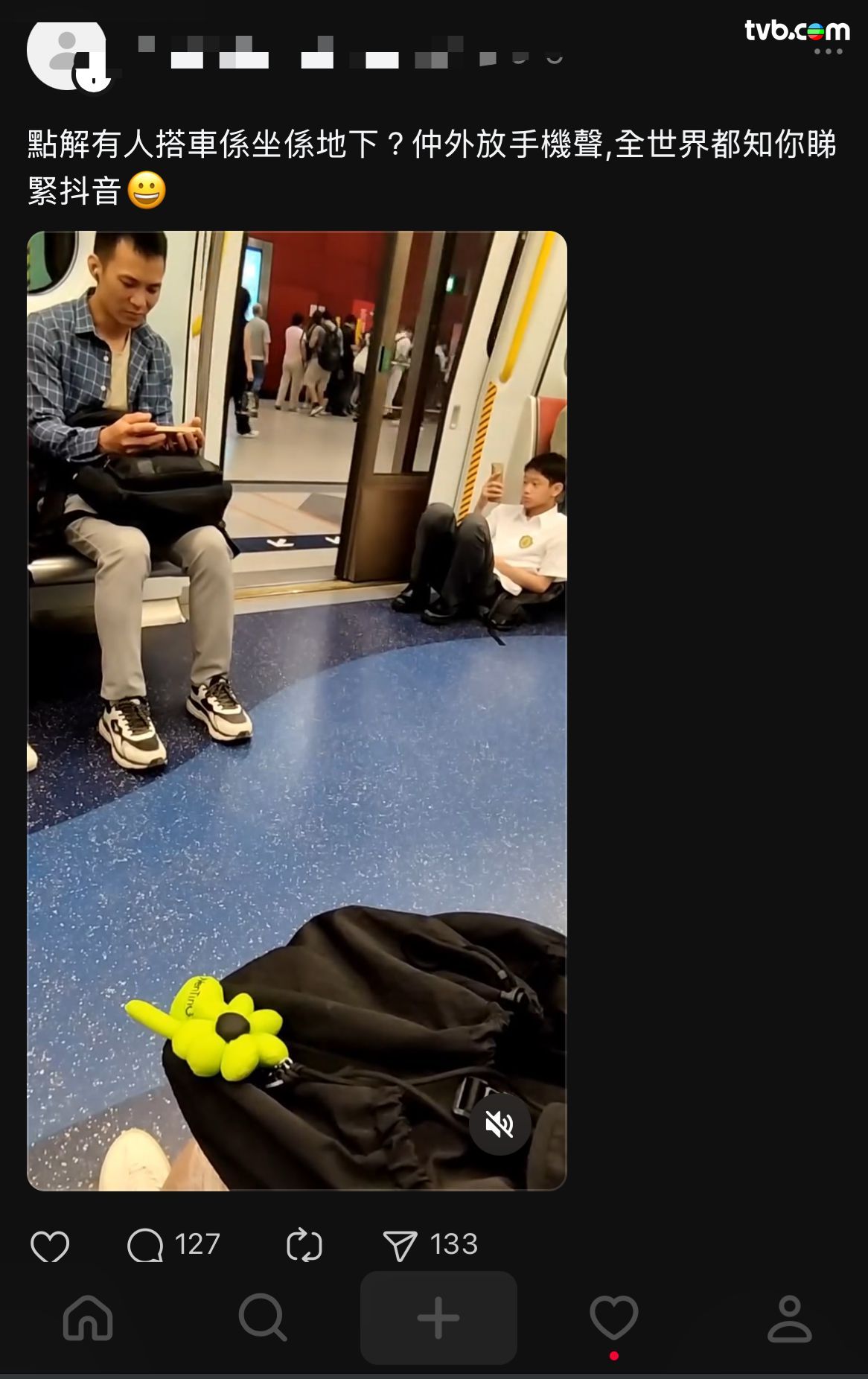 近日社交平台threads瘋傳影片,片中有名男學生無故坐在港鐵車廂地上,其書包則置於身後,惟當時車廂四周仍有多餘空位;片中男學生低頭注視著手機,並大聲播放著影片,樓主則在貼文稱:「點解有人搭車係坐係地下?仲外放手機聲,全世界都知你睇緊抖音!」