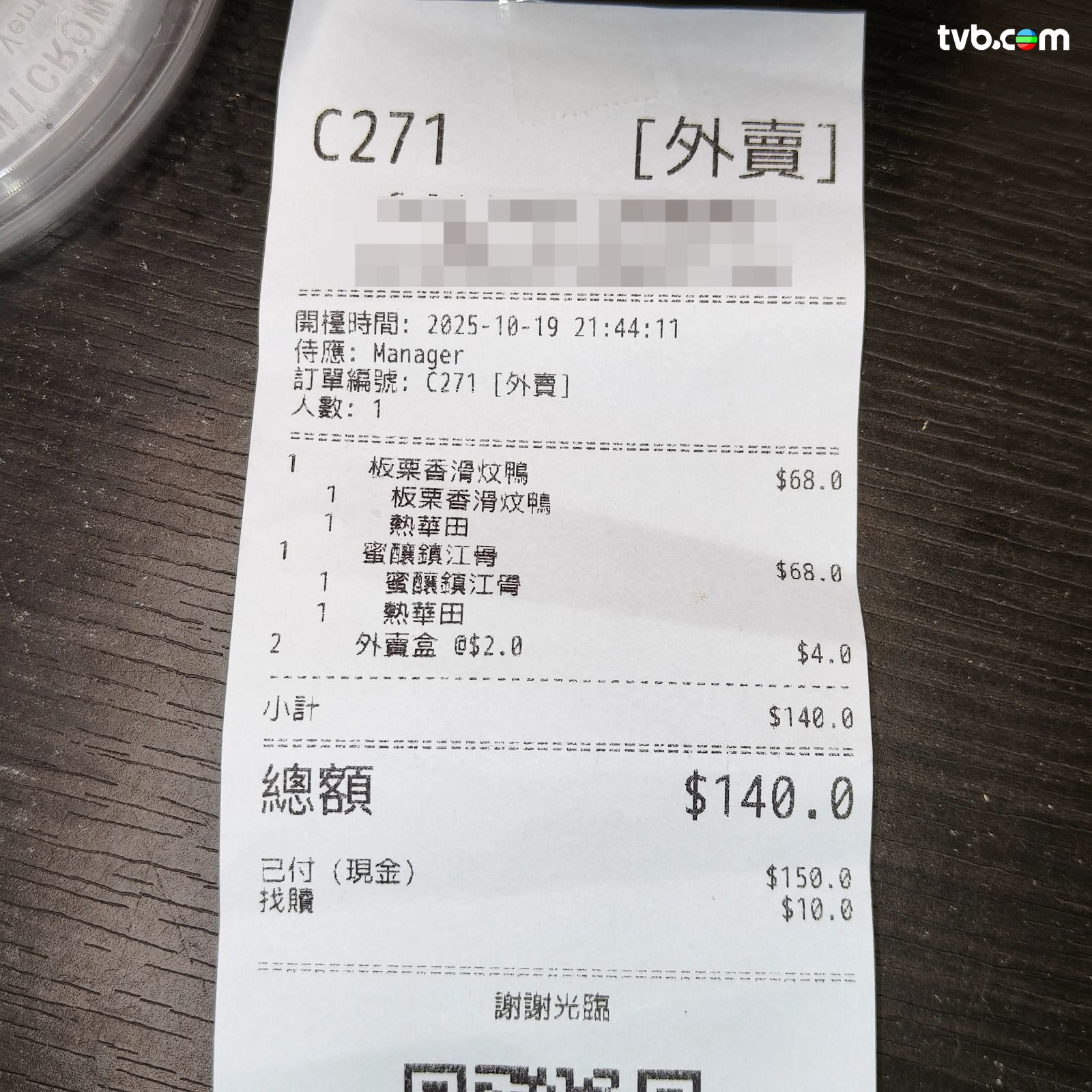 有網民分享,指其早前光顧筲箕灣某間餐廳外賣,共花費$140,購入兩款價值$68的客飯兼包凍飲,分別是「板栗香滑炆鴨飯」與「蜜釀鎮江骨飯」但外賣盒則要$2 一個;惟實物到場幾乎款款只得幾塊,就連半個膠盒也未盛滿,肉塊少得可憐,連樓主都大呻:「140蚊叫我食啲咁嘅嘢,咁少你不如賣人哋食剩嘅嘢比我算啦!」