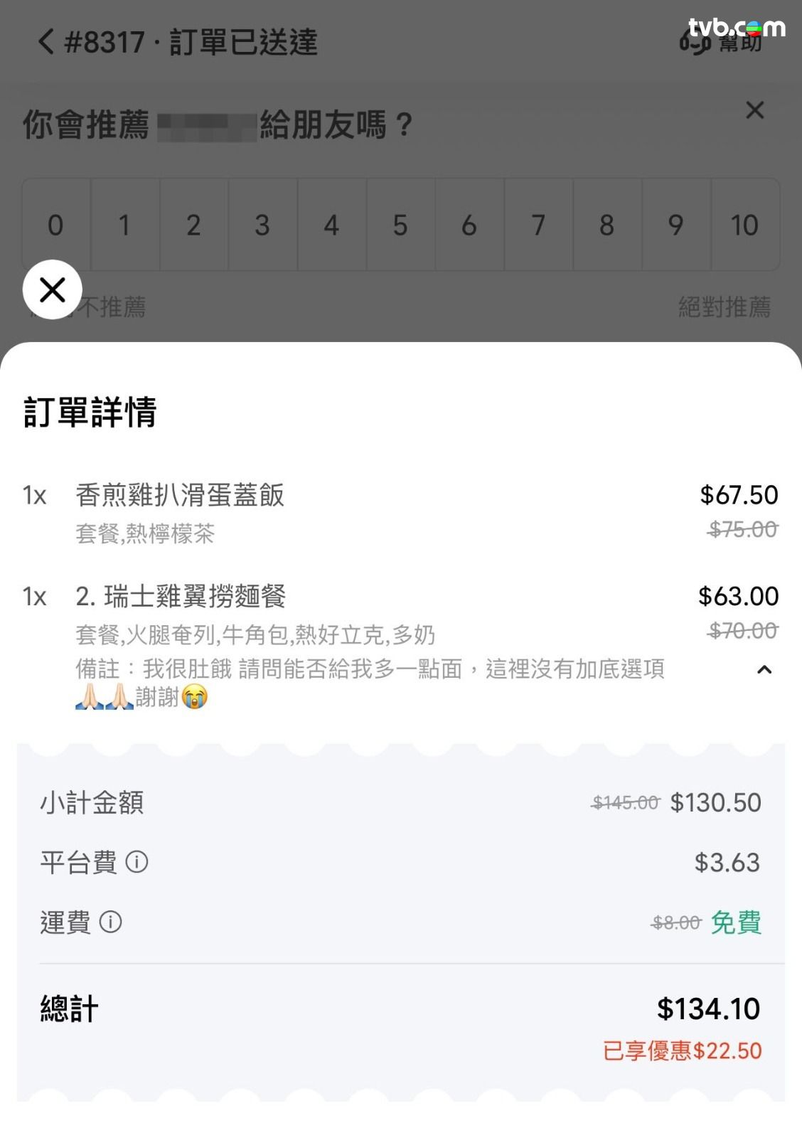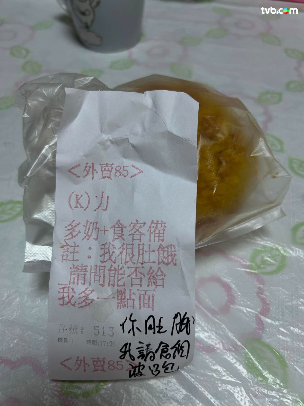 筲箕灣某茶餐廳好人好事!有網民近日在 Threads 分享,指自己早前光顧某茶餐廳,因為肚餓非常,透過外賣平台下單時欲要求「加底」,奈何系統沒有相關選項,只好在備註一欄禮貌留言「我很肚餓,請問能否給我多一點麵!」想不到餐廳額外送上大大個菠蘿包作「加料驚喜」,店方還在外賣單寫道「你肚餓,請你食個菠蘿包!」樓主亦坦言「呢間餐廳好有人情味」、「好有愛!」
