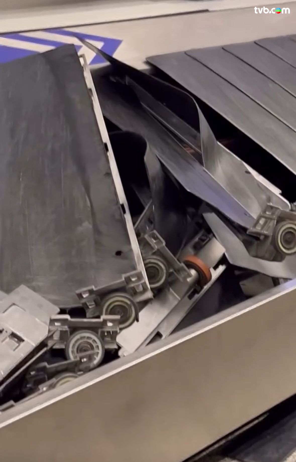 香港國際機場一向以高效見稱!但近日有網民上載驚人一幕,目擊機場內的行李輸送帶在運作期間竟然「爆開」,輸送帶的金屬板嚴重移位變形,多塊輸送板「炒起」並嚴重分離,場面非常誇張!樓主亦在帖文中寫道:「望住行李帶爆開!」