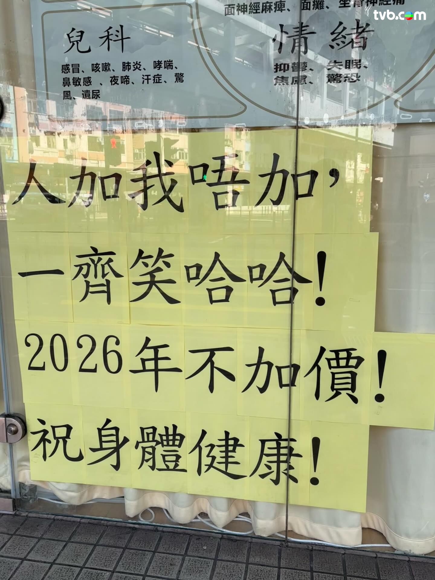 近日有網民分享,荃灣某診所貼出的告示,以黃紙黑字大大隻字寫著:「人加我唔加,一齊笑哈哈!2026年不加價!祝身體健康!」 據了解該診所位於荃灣,並承諾在逆市間凍價與市民共渡時艱,樓主亦在貼文中寫道:「好好笑!」;