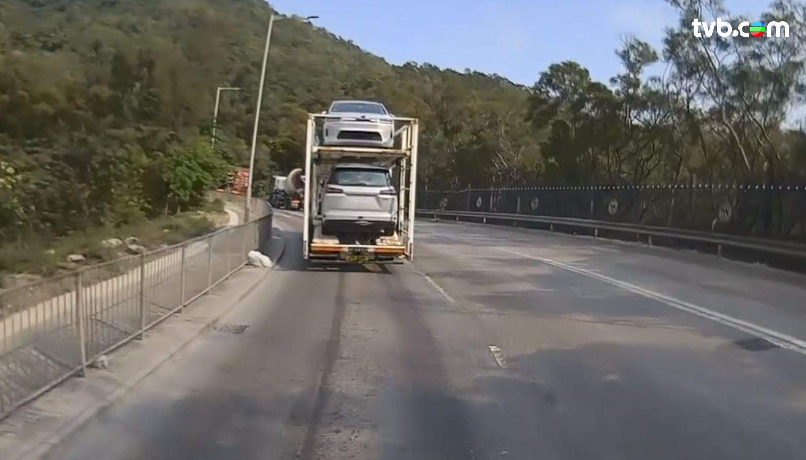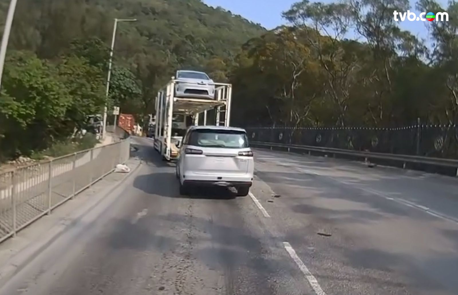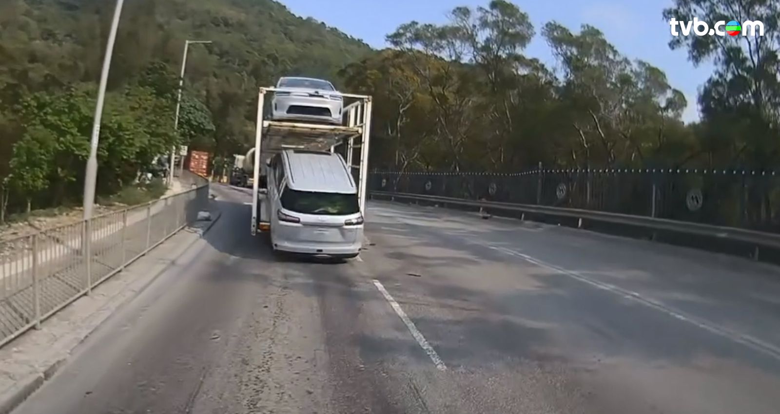 網絡瘋傳車Cam片段,事發於昨日(9日)下午約4時許,一輛載有兩部私家車的雙層運輸車,當駛至青衣西草灣道、近九巴青衣車廠對開路段,運輸車收慢再加速時,下層一輛私家車竟突然向後緩緩滑落馬路,在路面上搖晃數下後,驚險地停在路中心,整個過程險象環生!