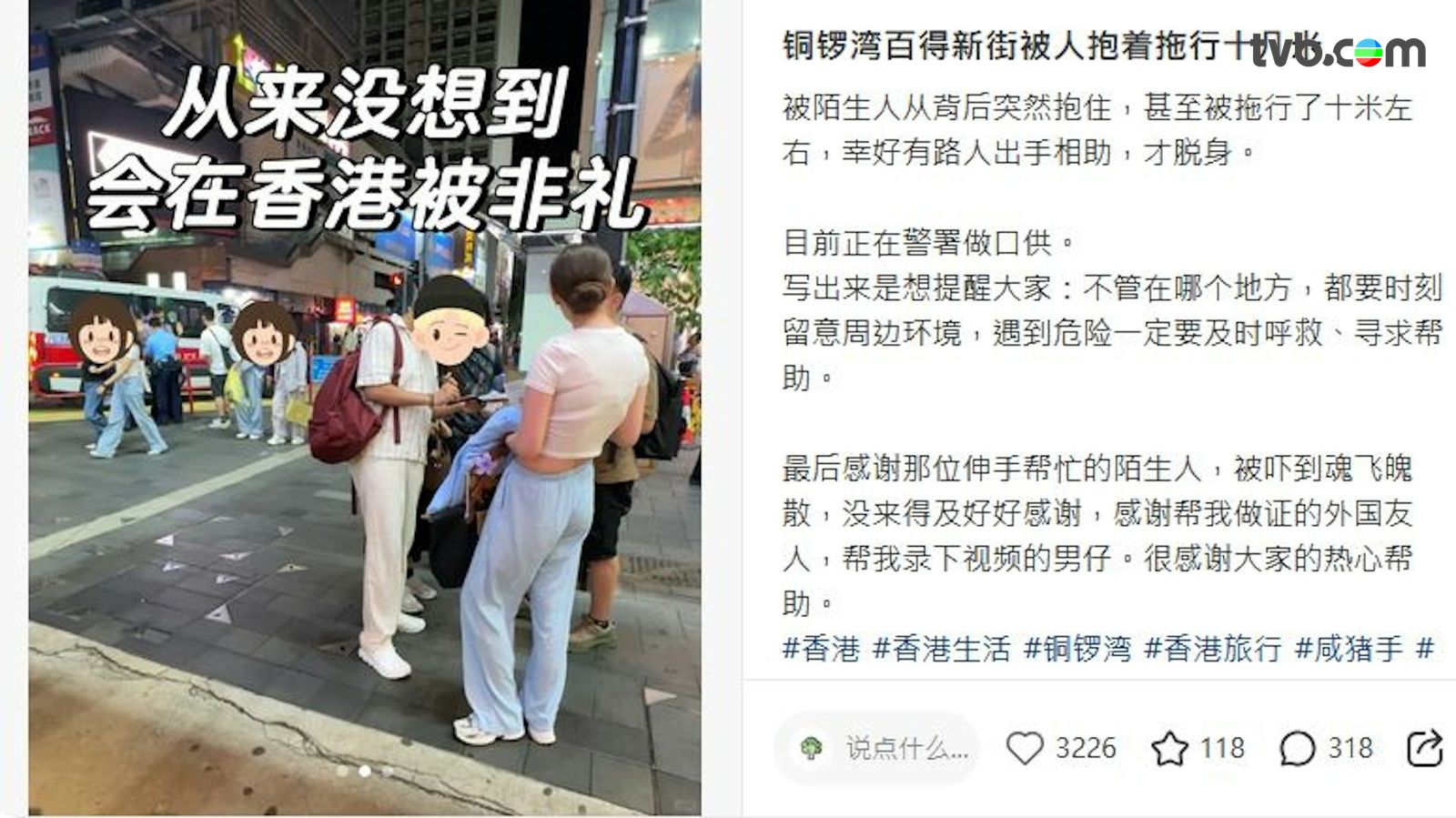熱褲女事後在小紅書發文,她指當時曾被男子從背後抱住,並拖行約十米,所幸途人即時伸出援手,讓她成功脫困;她亦透露,涉案男子已被警方拘捕,正等待上庭審理。熱褲女亦在帖文稱,自己從未想過會在香港遇上此類事件,並提醒大家無論身處何地都需保持警覺,遇到危險要及時呼救及尋求協助。