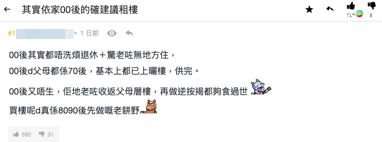 「買樓」是不少都市人的目標,最近竟有網民以「其實依家00後的確建議租樓」為題,發帖舉出6大原因,剖析00後為何只需「租樓」,惹來網民一片嘩然,即睇樓主所列6大原因: