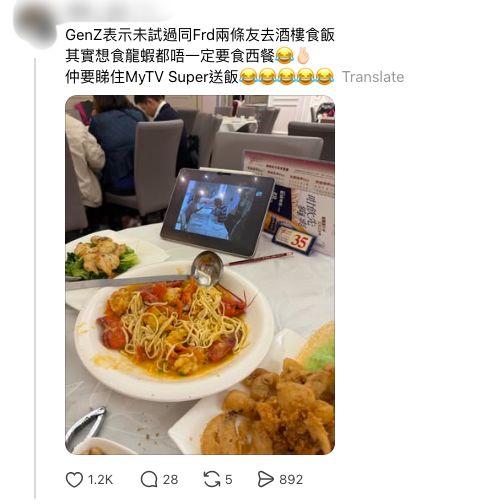 點樣食龍蝦最有性價比?GenZ有新Idea!有GenZ網民在社交網發文,指和朋友兩人去到酒樓食飯,並豪食龍蝦伊麵,留言:「GenZ表示未試過同Frd兩條友去酒樓食飯 其實想食龍蝦都唔一定要食西餐,仲要睇住MyTV Super送飯。」樓主續指:「我哋睇緊套首播嗰陣仲未出世嘅隔世追兇。」