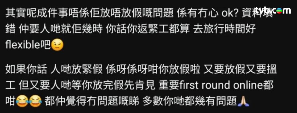 帖文隨即惹來網民負評,有人指「你咁樣cap人哋段email上嚟,佢見到既話等投訴你」、「公司原來咁處理D敏感資料架」、「人地咁有交帶仲想點」、「同你改期都要畀你公審?」樓主則於社交平台回應,指事件「與請假無關,而是求職者有冇心」,兼質疑對方資料填錯、又認為「去旅行時間好flexible吧!」樓主續指,首輪面試為網上形式,即使在旅行途中亦能參與「去旅行買個支架唔難掛?買件恤衫唔難掛?又要旅假又要搵工!」