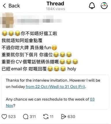早前(21日)某著名資企業HR職員,在社交平台公開一名求職者的電郵截圖,內容顯示對方因預定旅遊行程,希望將原定10月底的面試改期至11月初。涉事HR職員不但未同意,反而在帖文中譏諷:「你不如唔好搵工啦」,並指對方「咁大牌」,批評該求職者遞交的履歷表電話號碼出錯「份CV個電話號碼係錯嘅,已經email你,咁嘅回覆!」