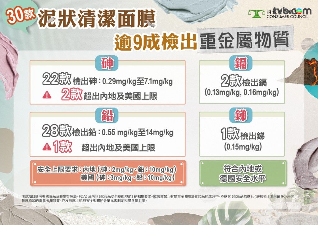 消委會於2025年3至4月期間從市面搜購30款泥狀清潔面膜,進行安全及功效檢測,發現超過九成樣本(28款)含有至少一種重金屬,其中AROMATICA及APIVITA兩款樣本的含量更超出中國及美國相關標準上限;惟上述兩款樣本售價分別為$310及$208,在30款測試樣本中,已經不算便宜。