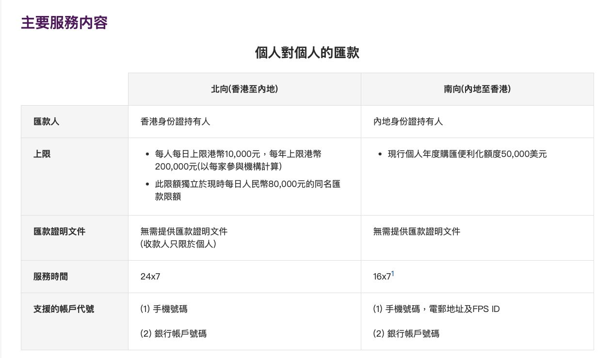 計劃下,北向匯款每日上限是一萬港元,不會計入現時8萬元匯款限額,每年上限20萬港元,24小時運作。至於南向匯款,受內地現時購匯額度限制,每人每年5萬美元,即上限約39萬港元,每日「朝七晚十一」提供服務。