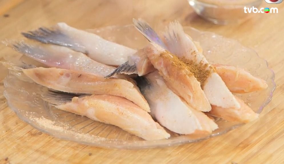 - 先把三文魚鮫醃製,先加入紹酒、五香粉、以及椒鹽醃製。