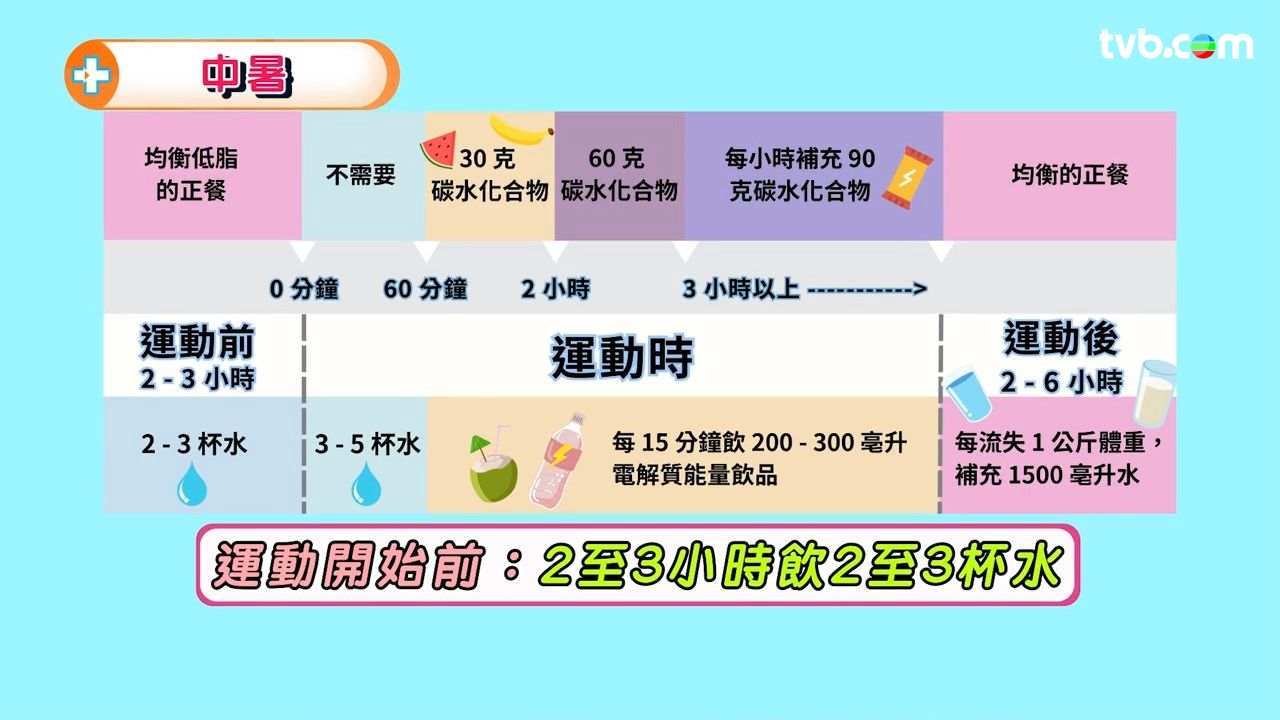 - 運動開始前:2至3小時飲2至3杯水