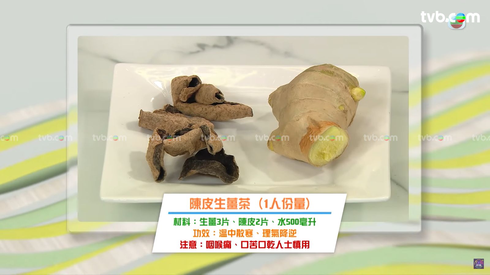 張博士在節目尾聲推薦大家一款生薑陳皮茶,可用生薑3片、陳皮2片、水500毫升泡茶飲用,具有溫中驅寒、理氣化濕的功效,但要注意咽喉痛、口苦口乾人士慎用。