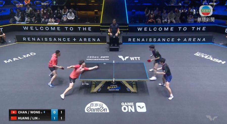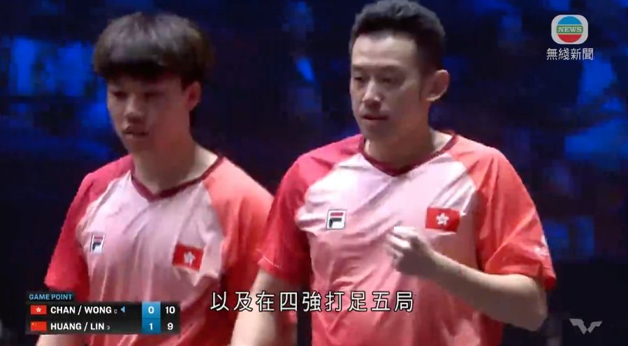 陳顥樺反手拉,林詩棟下手擋,黃鎮廷一板直線,落重旋。這對港隊組合先輸7-11下,贏11-9扳平局數。