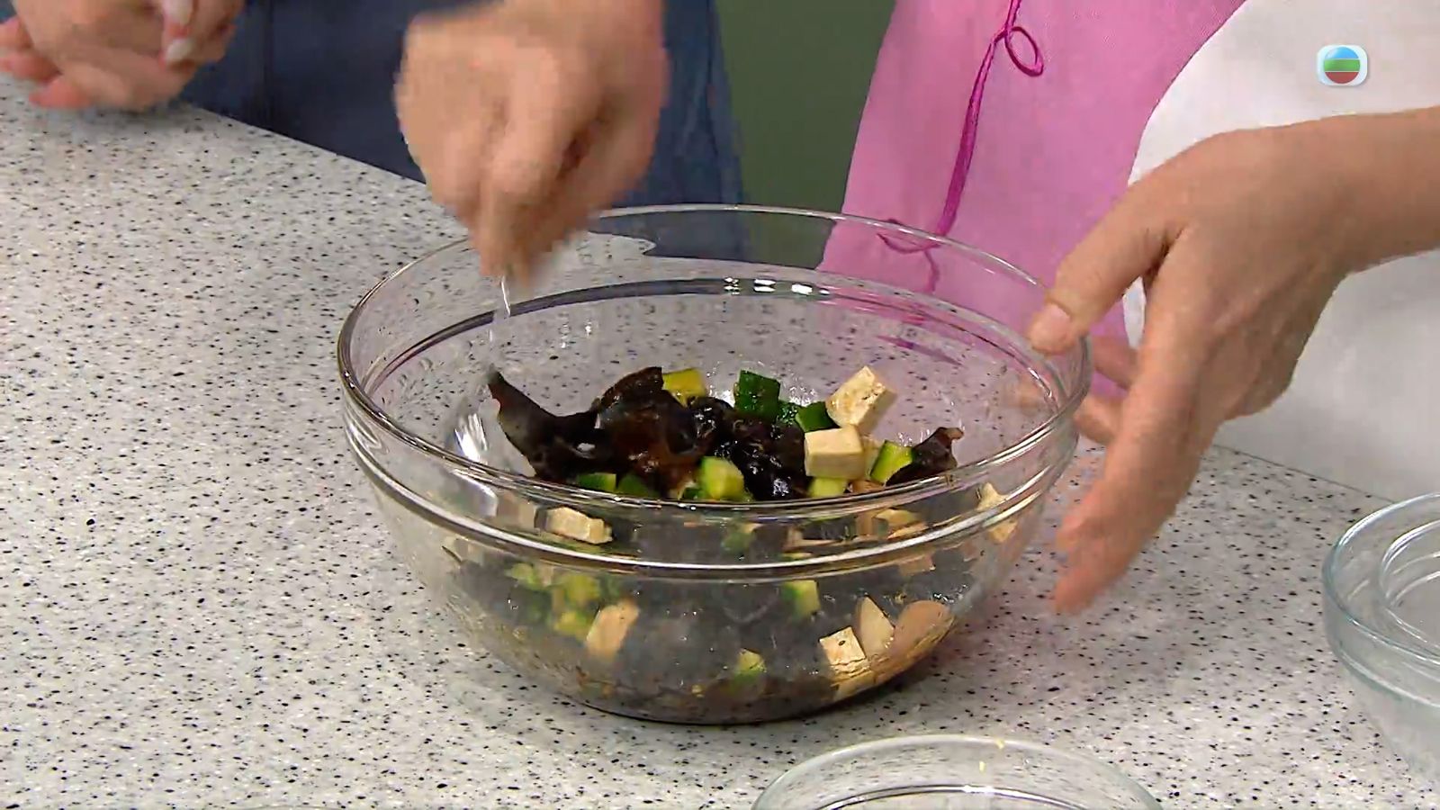 取出素雞切粒,把涼菜醬汁拌勻,放入青瓜粒、雲耳片、素雞粒跟花生,拌勻即成潮州涼菜。