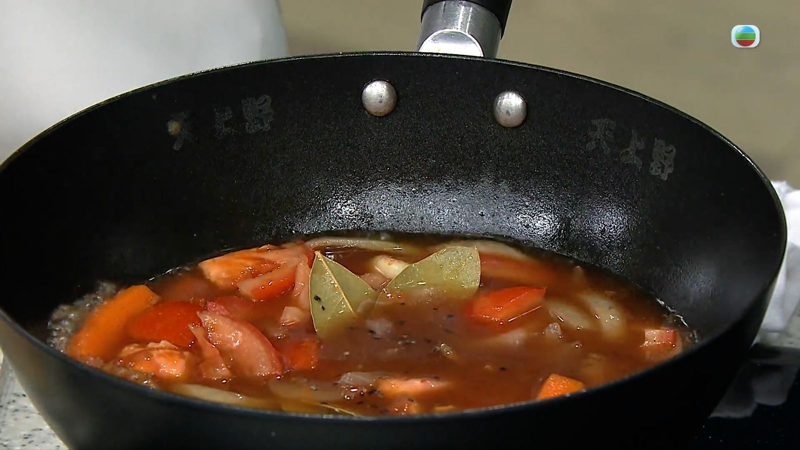 3.下番茄、上湯、茄汁、喼汁、香葉、黑胡椒、糖、鹽略煮一會成湯汁。