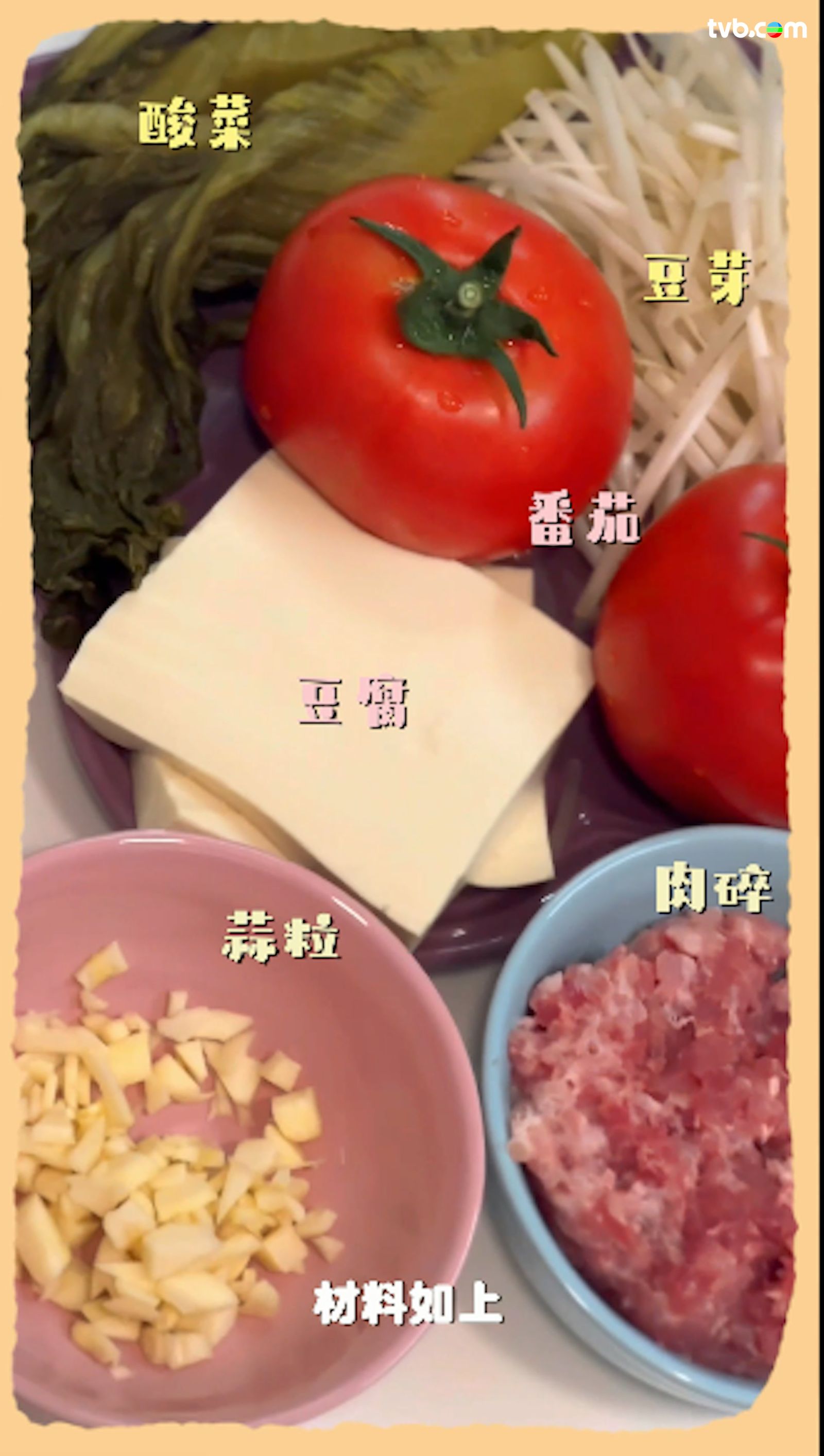 - 首先將番茄及酸菜徹底洗淨並切成適口大小,備用。