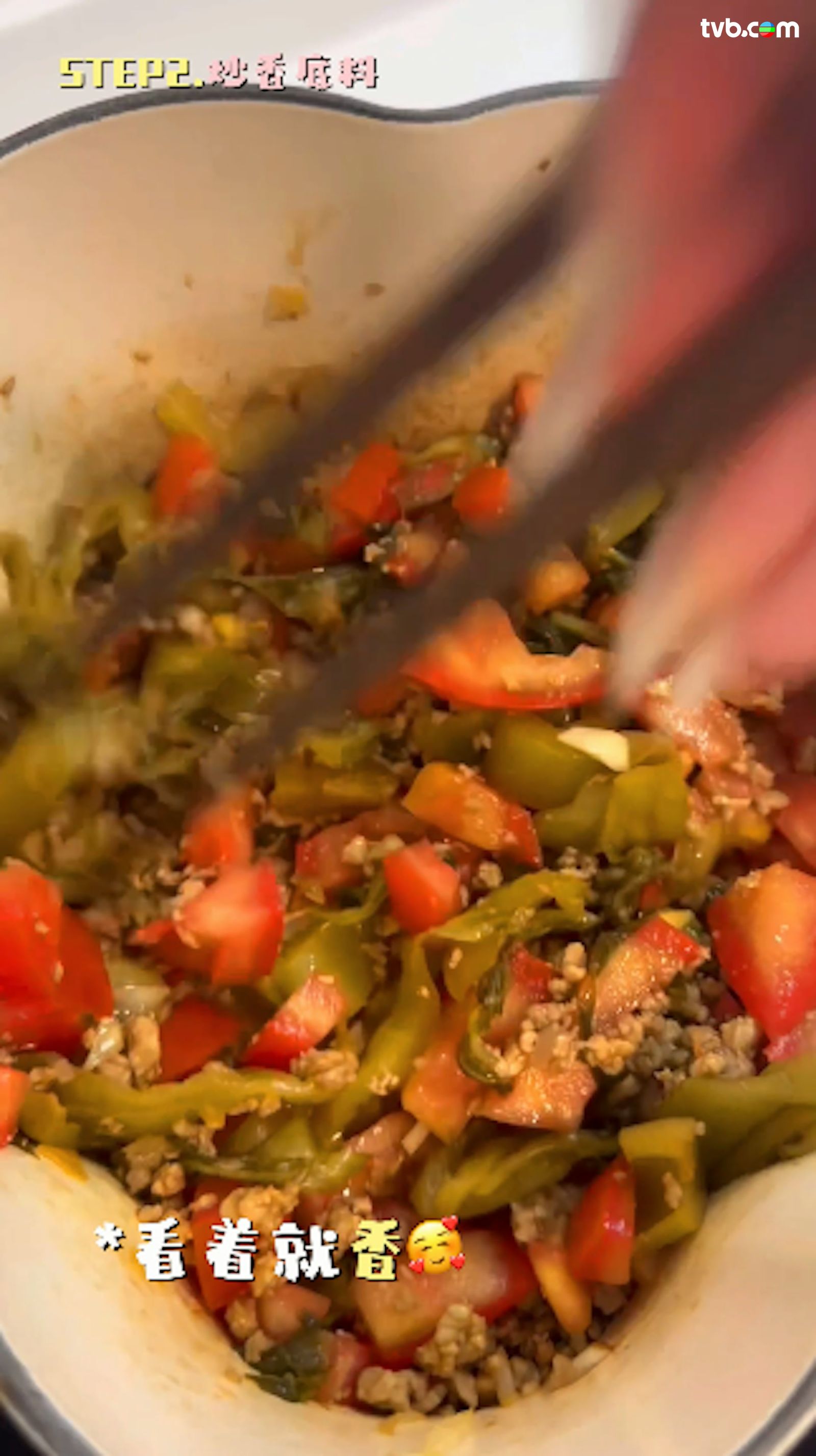 - 投入酸菜、番茄及糖,並加入適量熱水煮滾,使料汁充分融合。