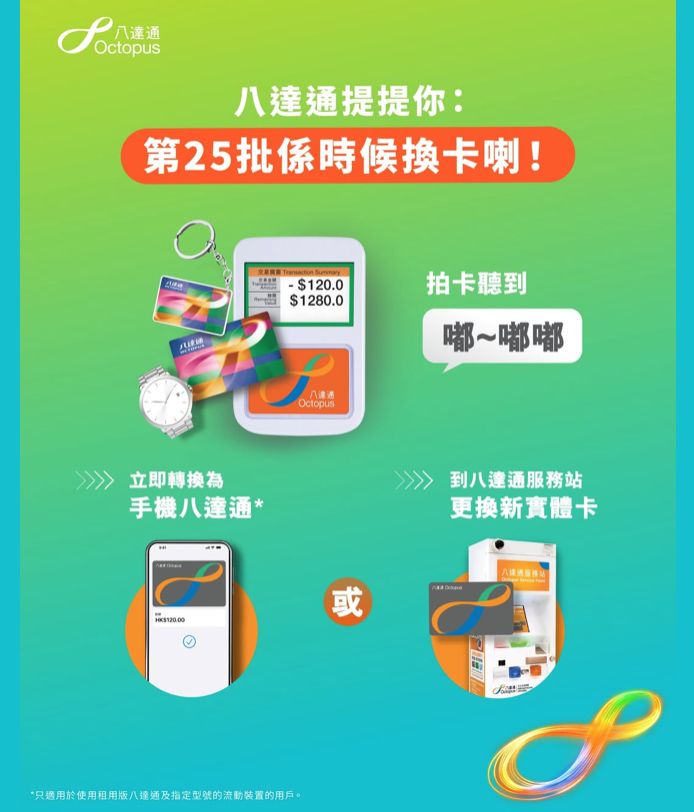 八達通更換|近年,八達通分批更換於2002年及其後發出的租用版八達通,而八達通再宣布有部分批次的租用版八達通即將於2026年初到期。如果大家使用八達通時,聽到特別的聲效就要留意,因為逾期更換是需要行政費!