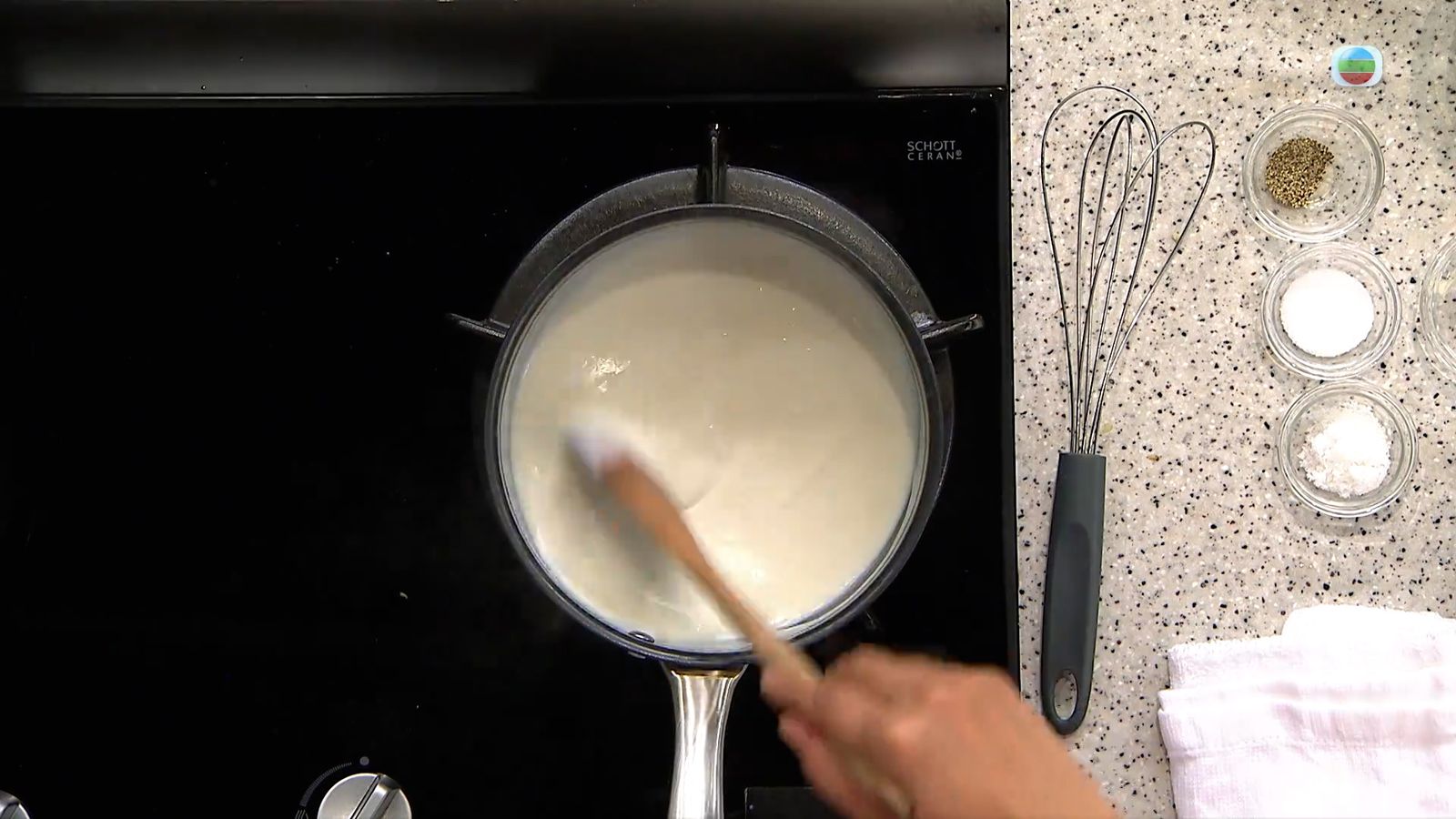 白汁的調製方法是先煮溶牛油,拌入麵粉後慢火拌成麵撈。關火倒入凍或室溫牛奶,然後重新開火拌成黏稠的白汁。