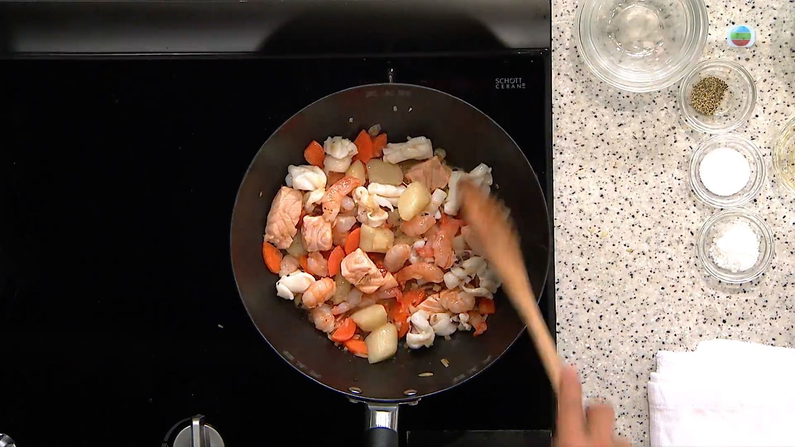 海鮮切片切粒,當中魷魚、帶子、蝦要汆水至半熟。之後起油鍋,爆香乾蔥蓉及蒜蓉後加入甘筍片炒2分鐘,然後下海鮮拌炒,加白葡萄酒煮至半乾。