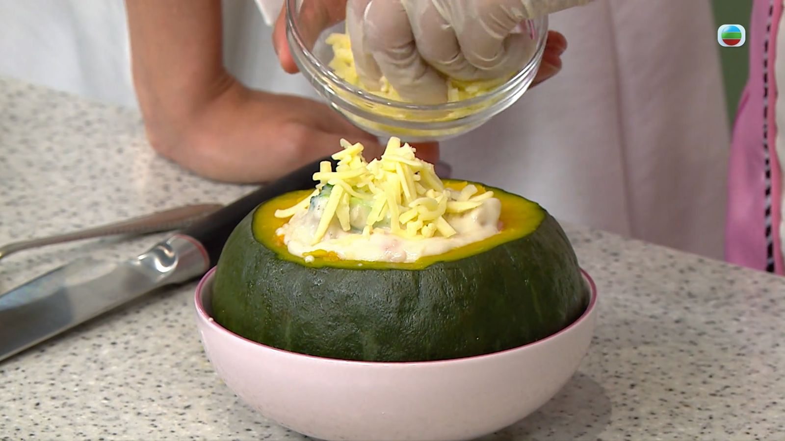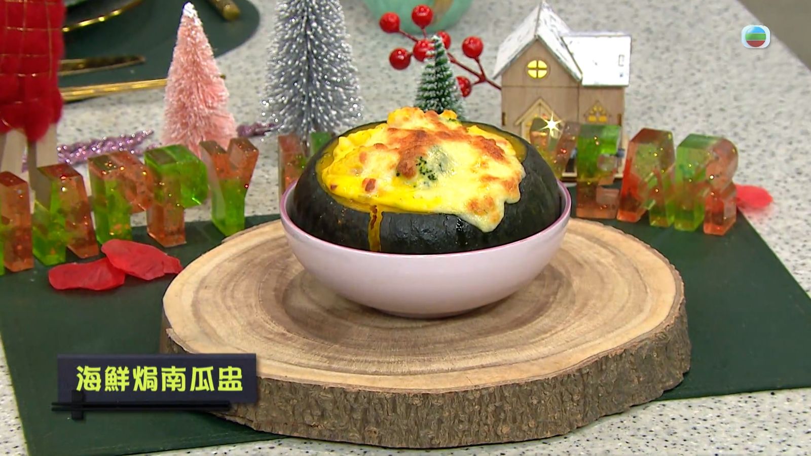 今集《流行都市》「睇餸食飯」環節有 Margaret傅季馨 教大家做「海鮮焗南瓜盅」。