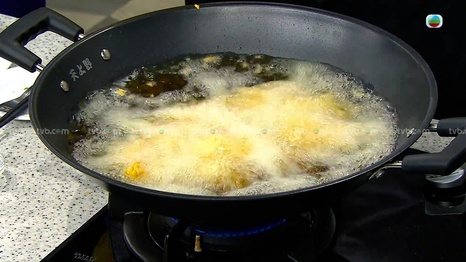 5.油鍋燒熱至攝氏170度,雞髀拌入炸粉後下油鍋,炸約7至8分鐘,待金黃熟透,撈起備用。