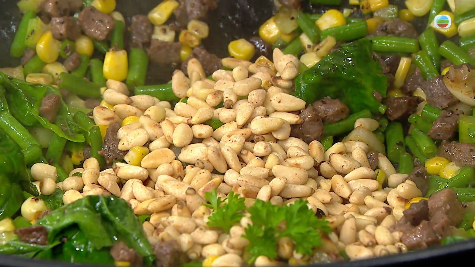 吞拿魚切粒,起油鍋煎香後下鹽、胡椒粉調味,盛起備用。另外粟米預先汆水隔乾,松子仁預先白鑊炒香備用。