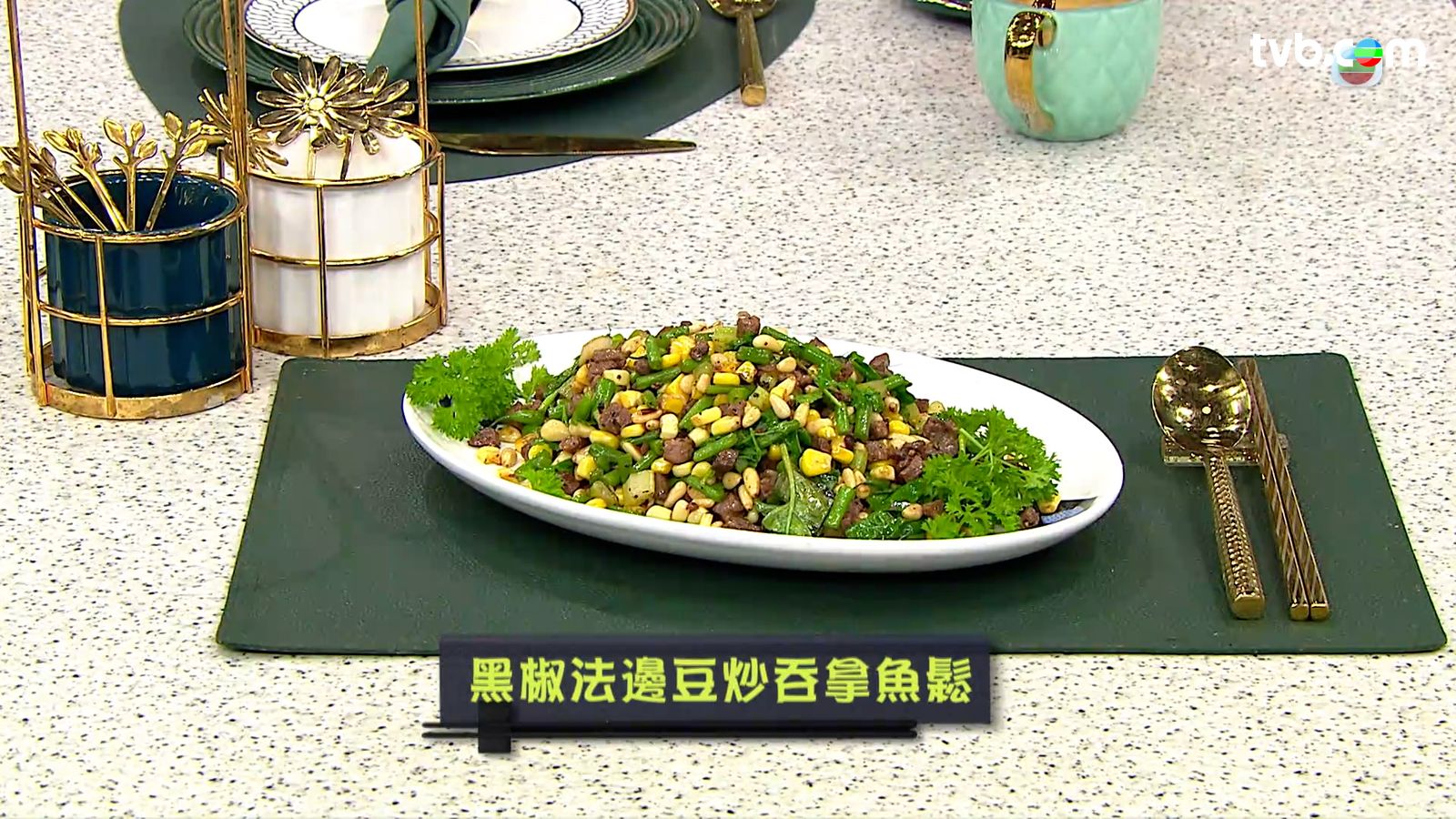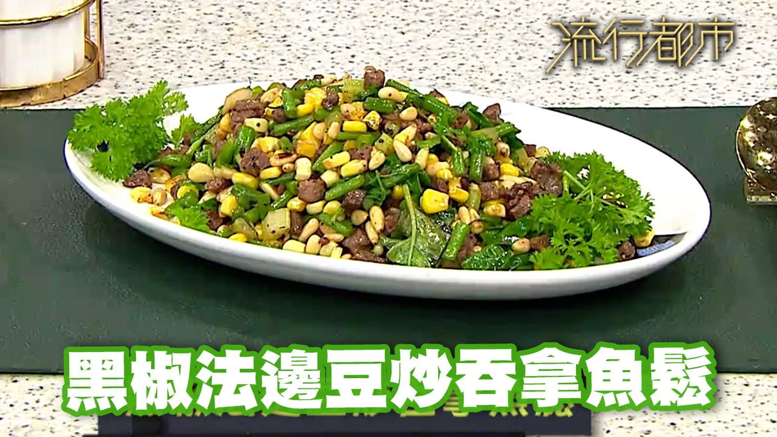 今集《流行都市》「睇餸食飯」環節有 Leslie陳國賓 教大家做「黑椒法邊豆炒吞拿魚鬆」 。