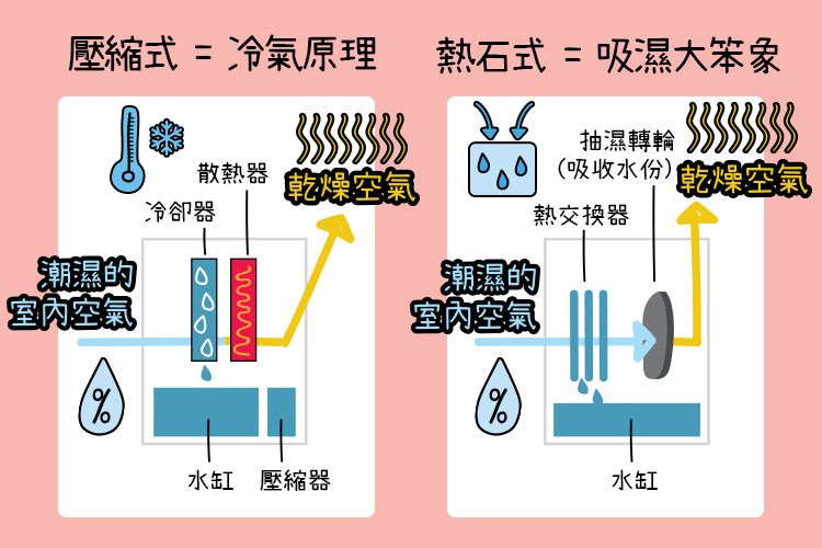 抽濕機種類可以分為壓縮式及熱石式,一圖睇清抽濕機種類: