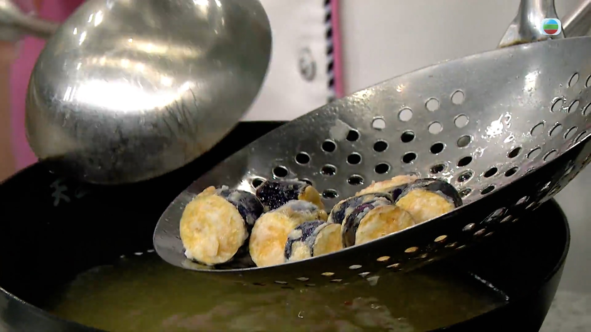 5.炸漿、生粉混合成炸漿粉,豬頸肉、茄子分別沾上炸漿粉,分別下油鍋炸至金黃,取出待1分鐘,下鍋翻炸一次。
