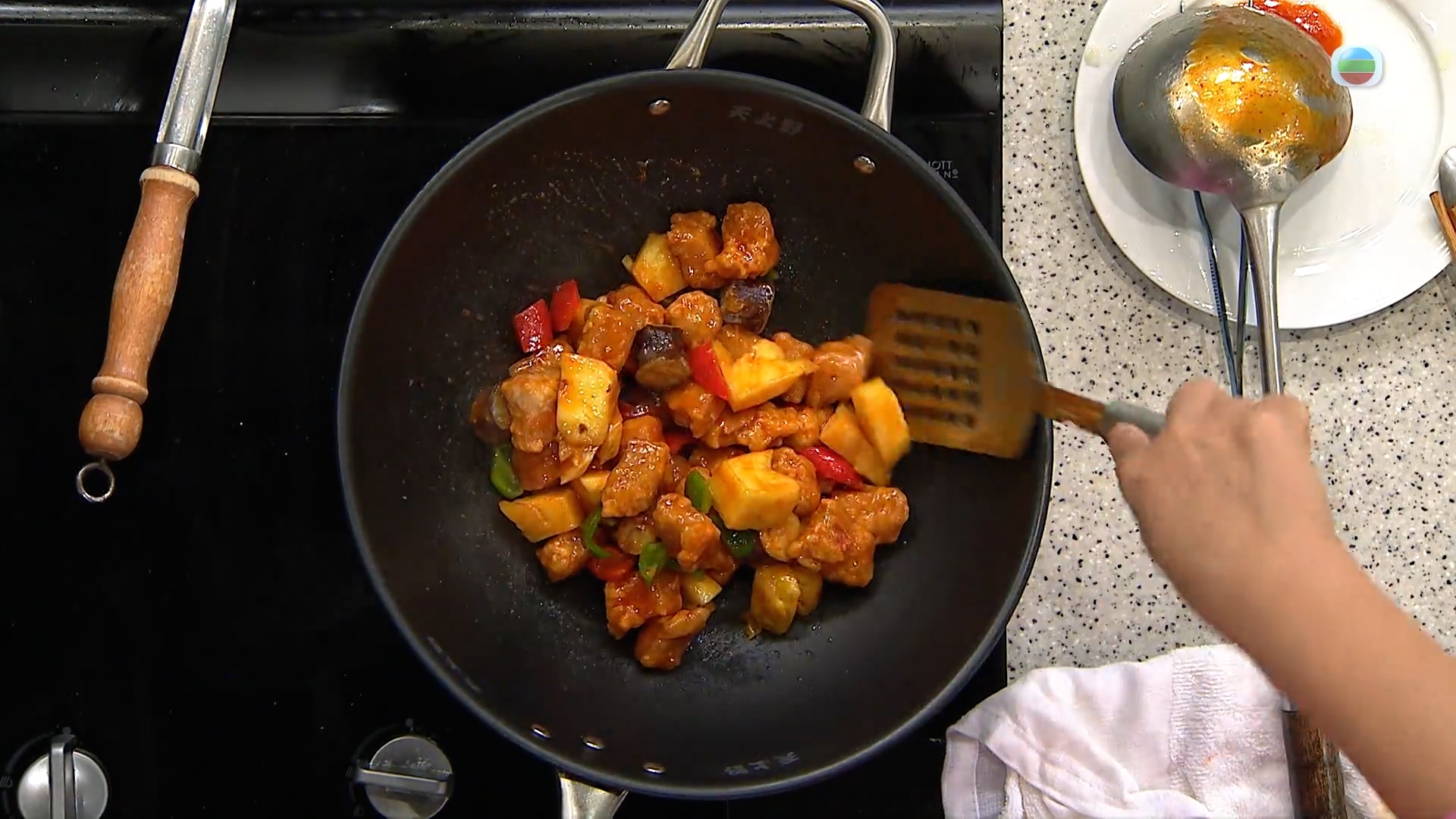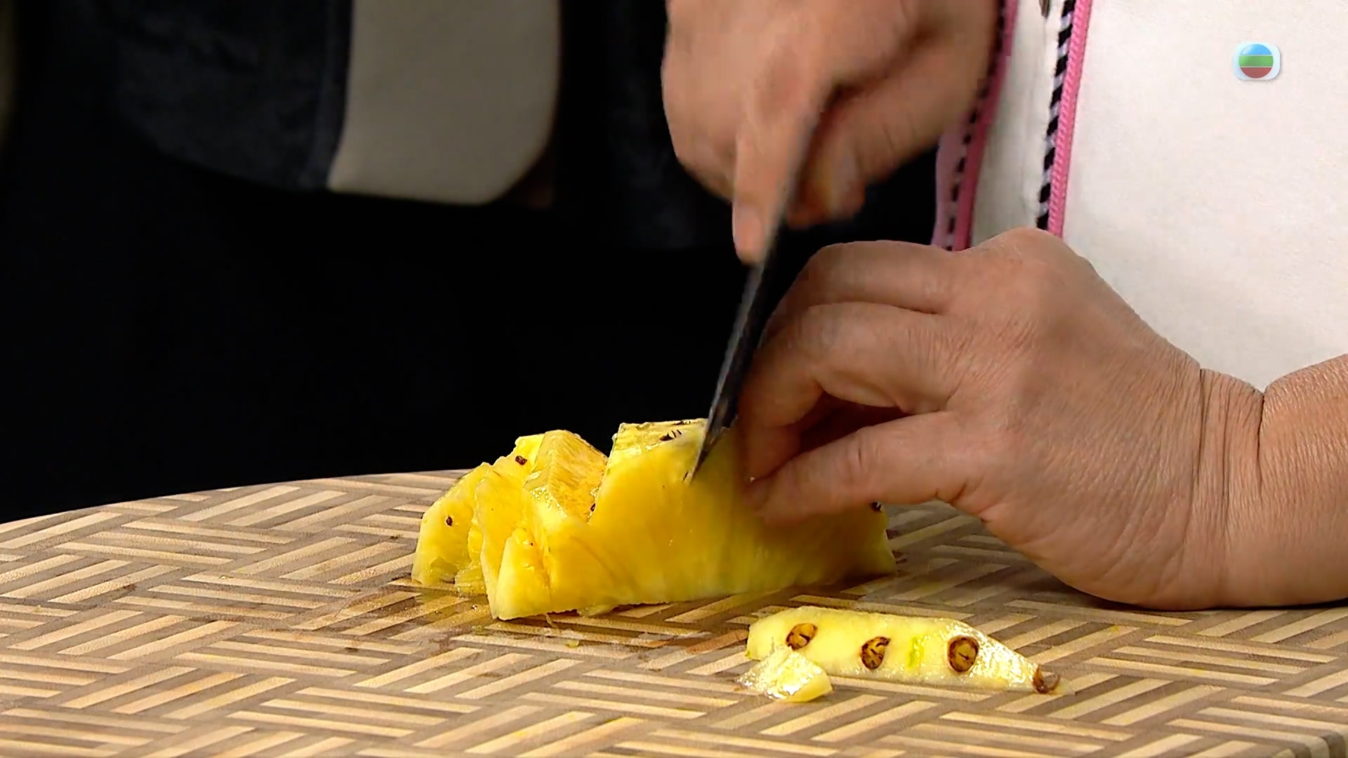 三姐找來靚菠蘿,示範一味菠蘿風味的香辣咕嚕肉。處理菠蘿時要起出其「釘子」,這裡三姐使用傳統方法,用V字切法去掉帶有釘子的肉,雖然耗時長,卻可以保留更多的肉不浪費。
