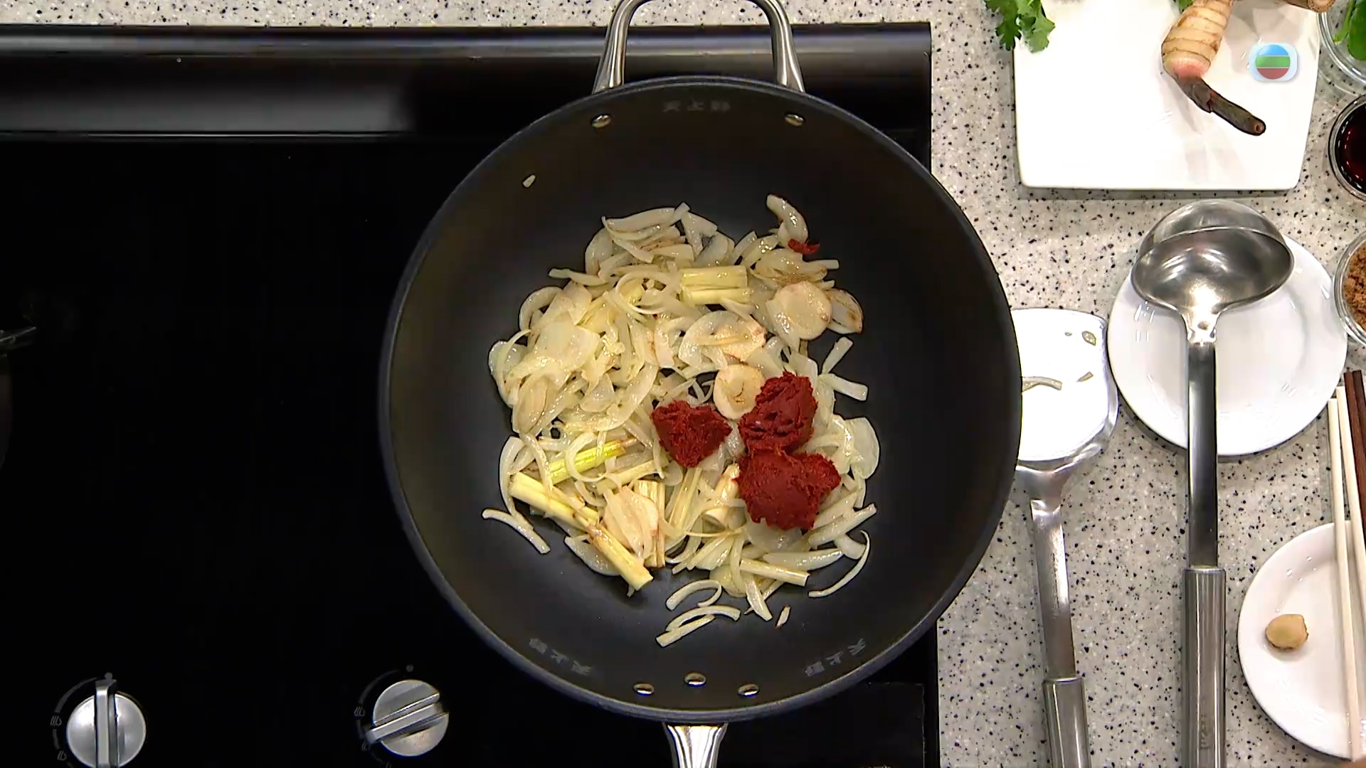 2.洋蔥下油鍋爆香,加入香茅、南薑、泰式紅咖喱醬、蝦醬略炒一會,下少許油炒勻,注入椰漿、雞湯,放入檸檬葉,煮約20分鐘成湯底,用蠔油、蔗糖、魚露調味。